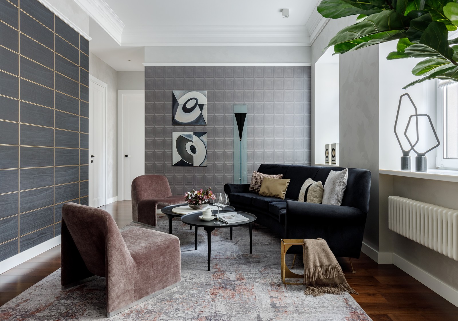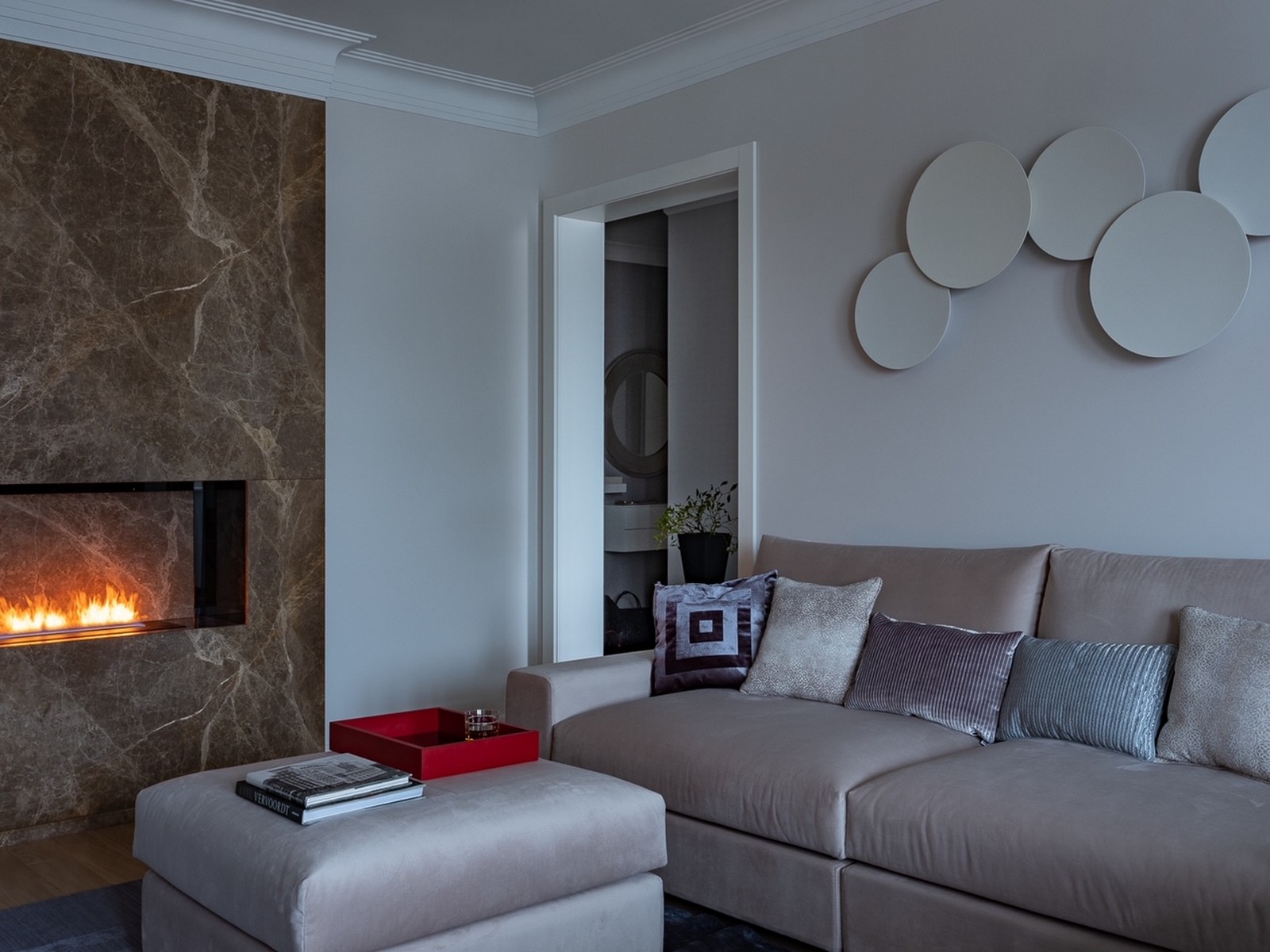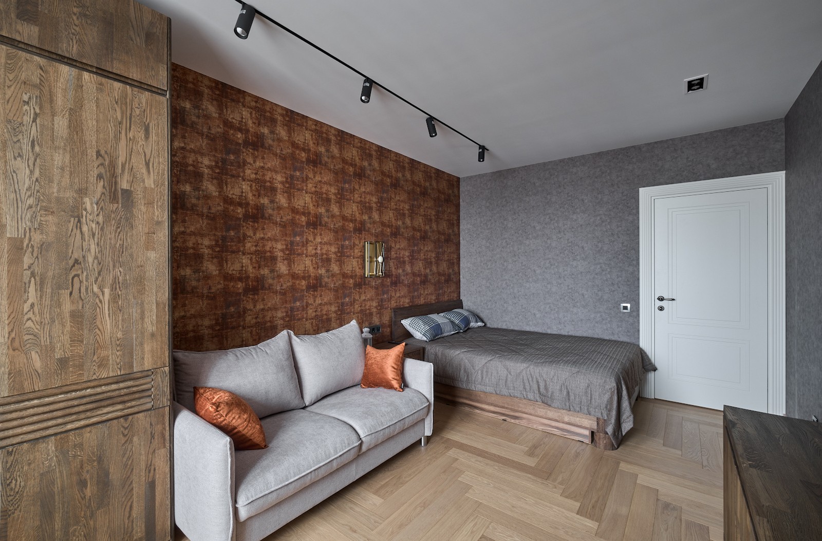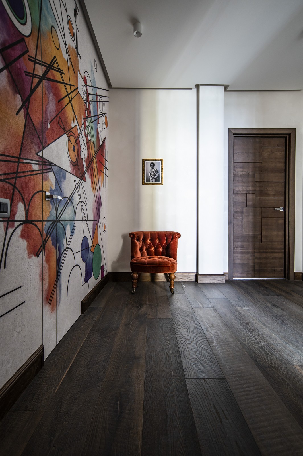 Квартира общей площадью 140 м² в центре Екатеринбург. В отделке интерьера использованы преимущественно натуральные материалы. Двери LEVEL приятного песочного оттенка отделанные шпоном дуба. Широкая паркетная доска специального нестандартного размера – 280 на 30 сантиметров, изготовленная фабрикой LEGEND. А стена за диваном выполнена из обоев из натуральной тыквы!