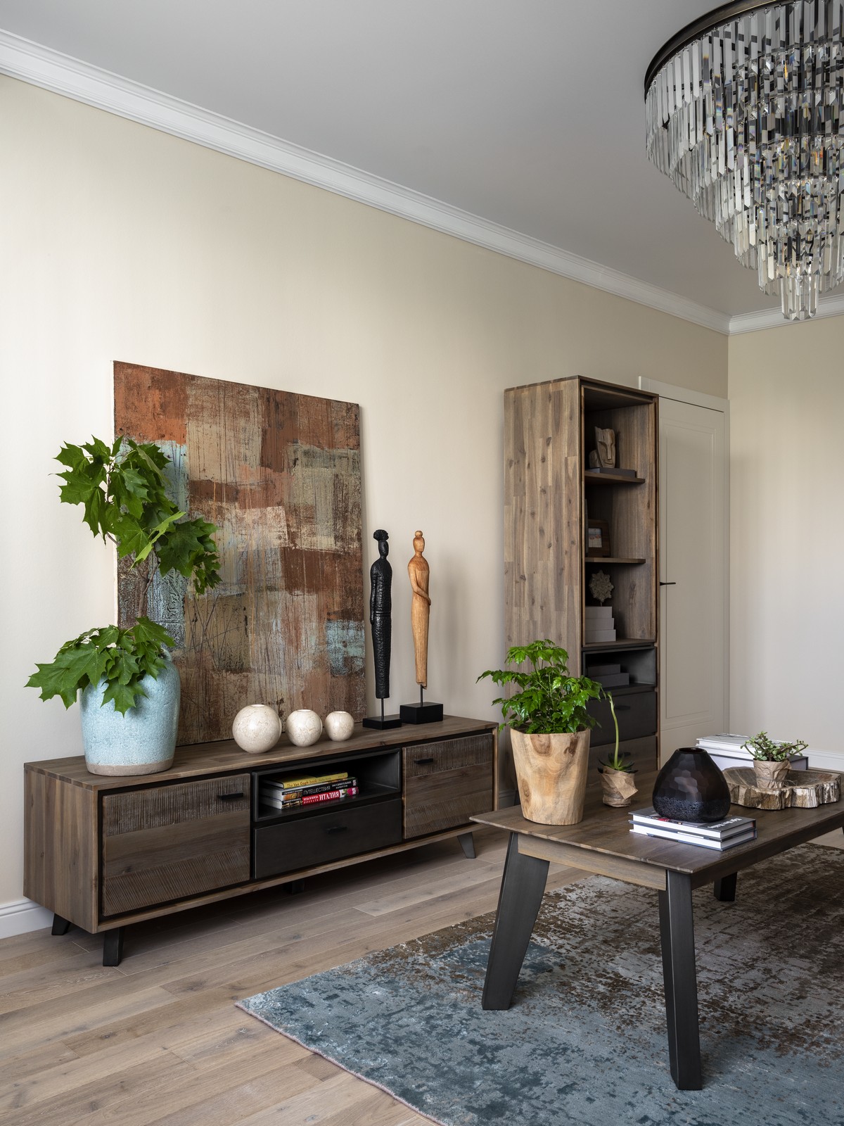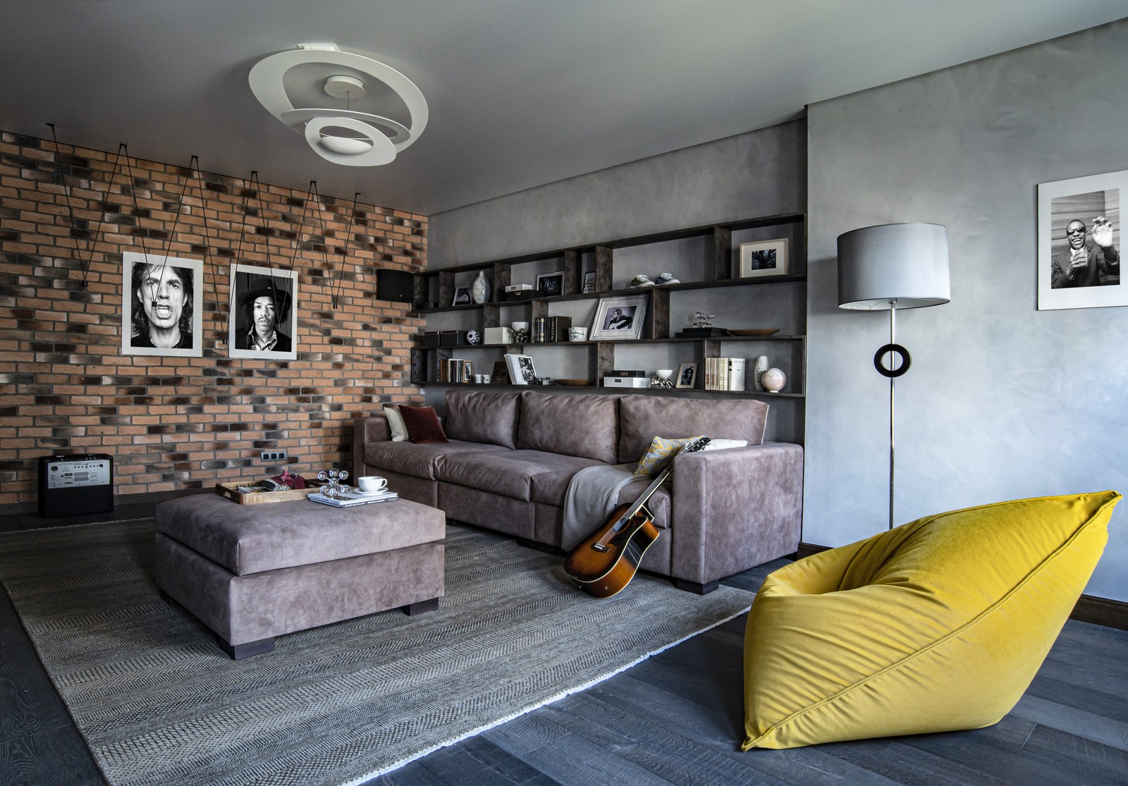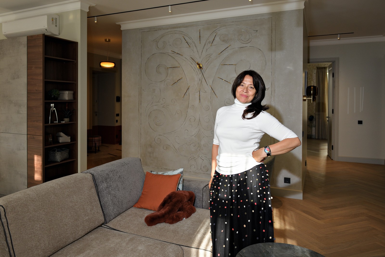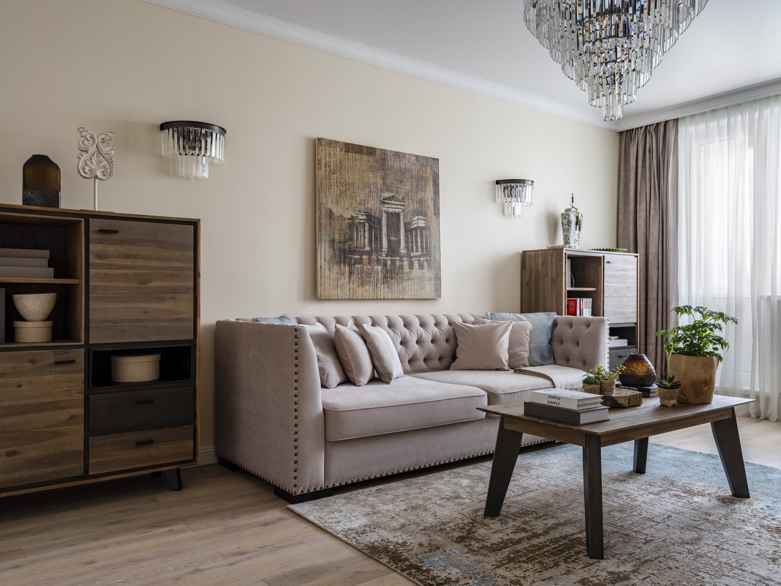 Квартира общей площадью 140 м² в центре Екатеринбург. В отделке интерьера использованы преимущественно натуральные материалы. Двери LEVEL приятного песочного оттенка отделанные шпоном дуба. Широкая паркетная доска специального нестандартного размера – 280 на 30 сантиметров, изготовленная фабрикой LEGEND. А стена за диваном выполнена из обоев из натуральной тыквы!
