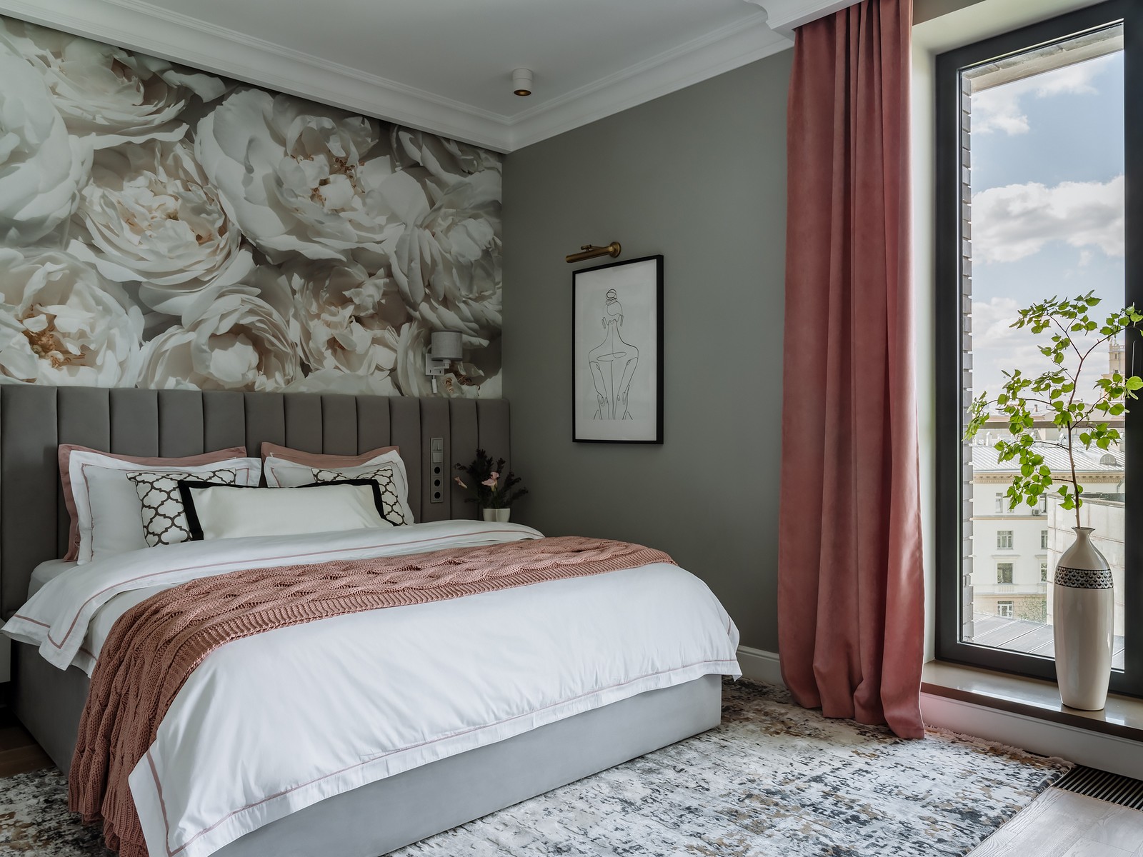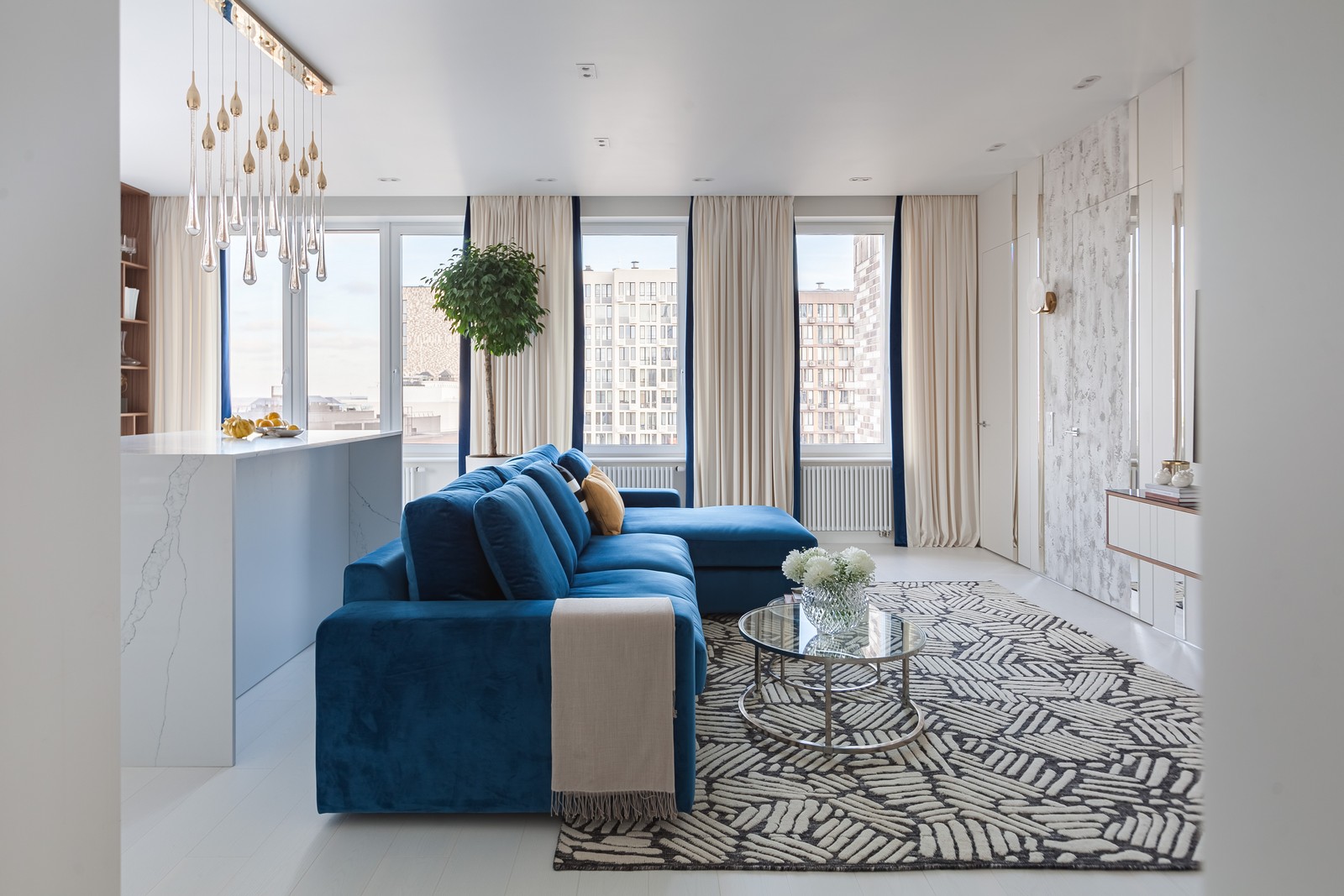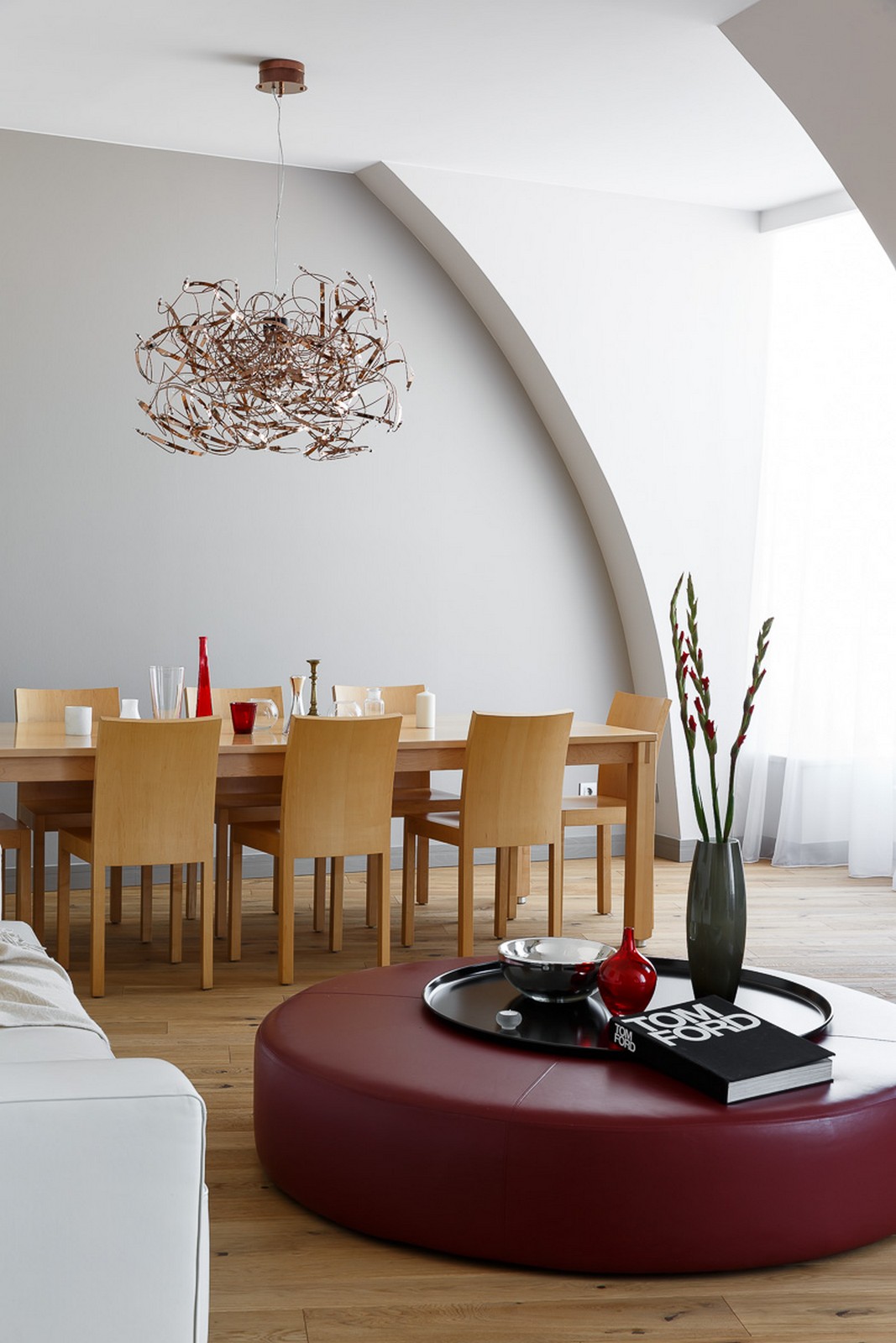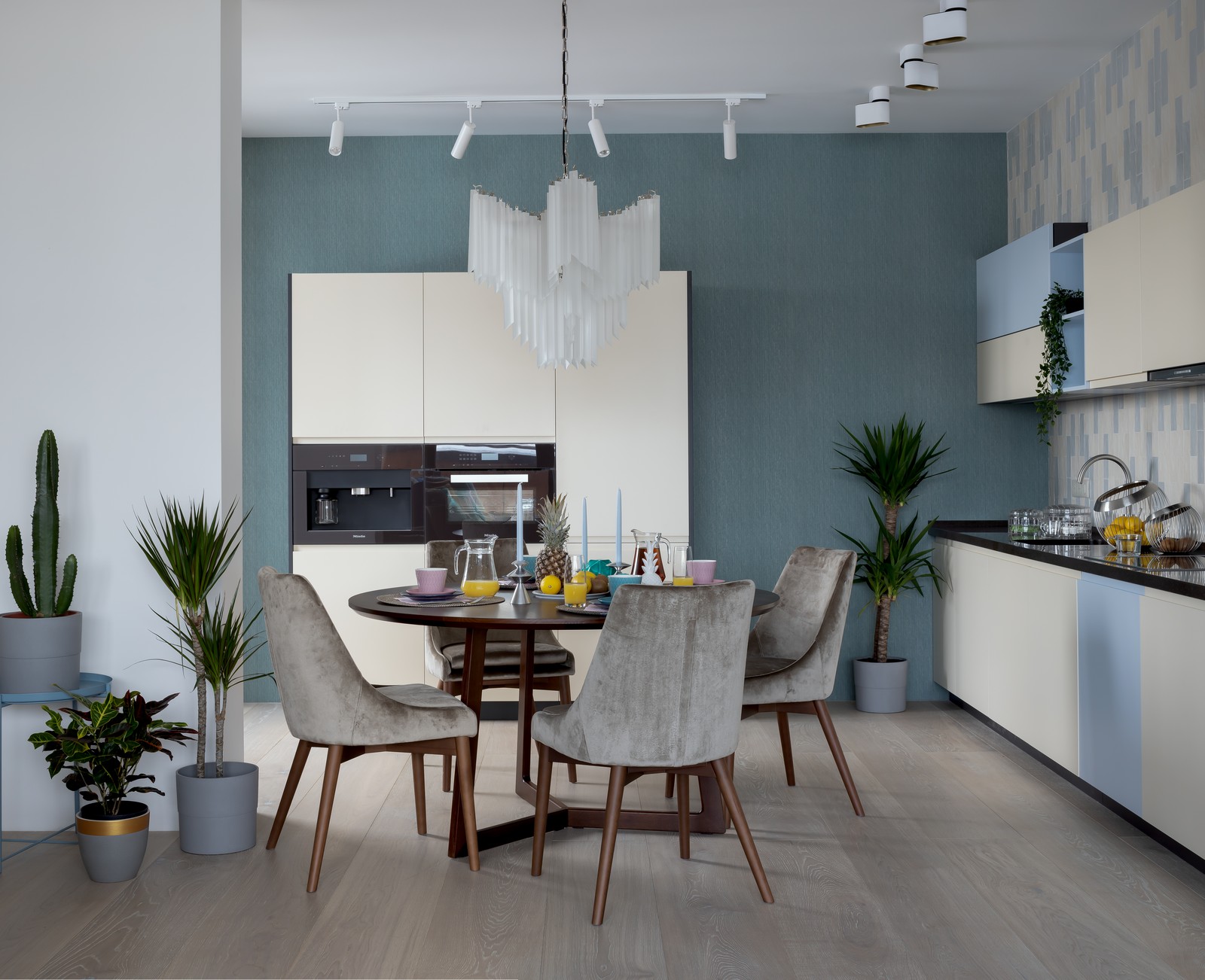 Квартира общей площадью 140 м² в центре Екатеринбург. В отделке интерьера использованы преимущественно натуральные материалы. Двери LEVEL приятного песочного оттенка отделанные шпоном дуба. Широкая паркетная доска специального нестандартного размера – 280 на 30 сантиметров, изготовленная фабрикой LEGEND. А стена за диваном выполнена из обоев из натуральной тыквы!