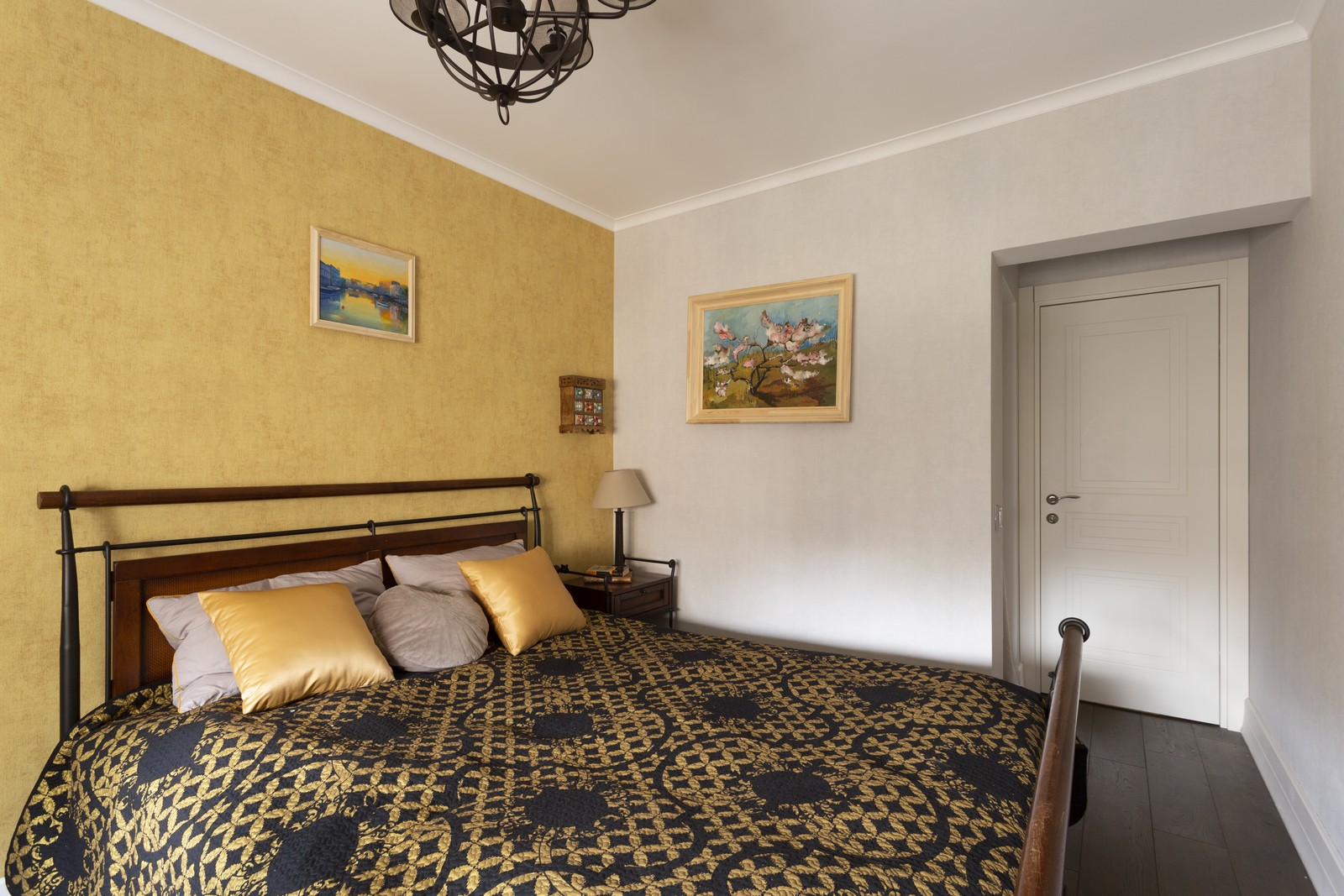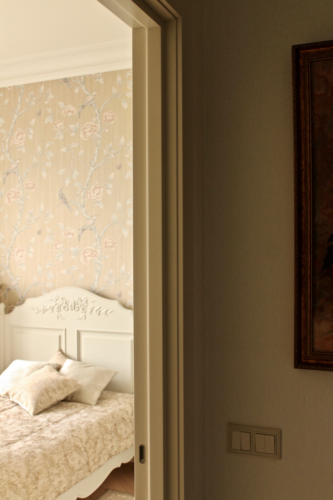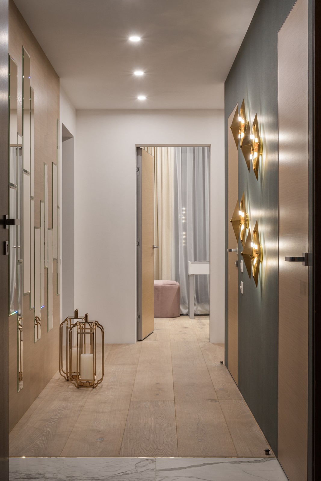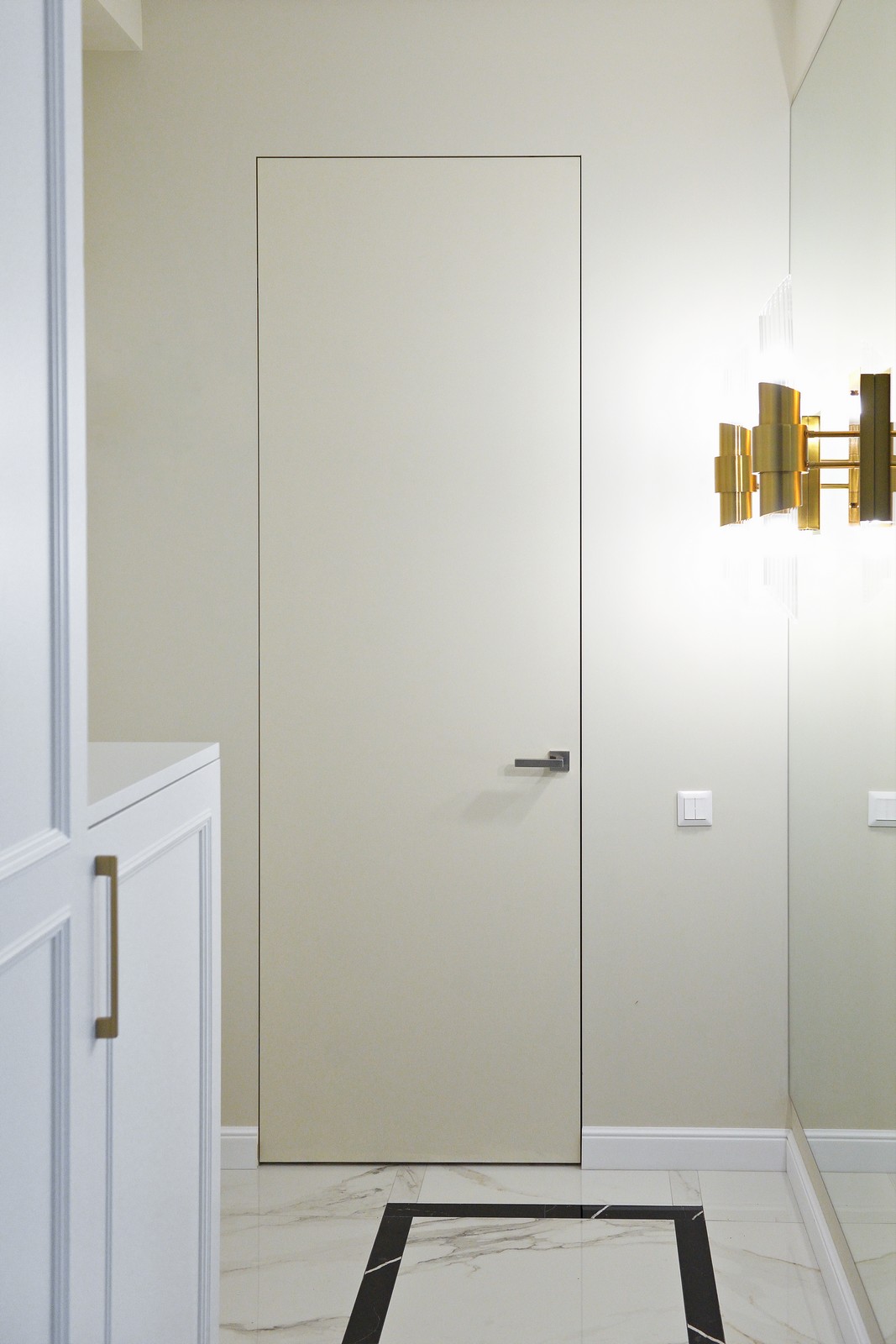Обратите внимание на удачную находку дизайнера - роскошная классическая дверь VISCONTI практически сливается по цвету со стеной, границу обозначают лишь элегантные полоски золотой патины.