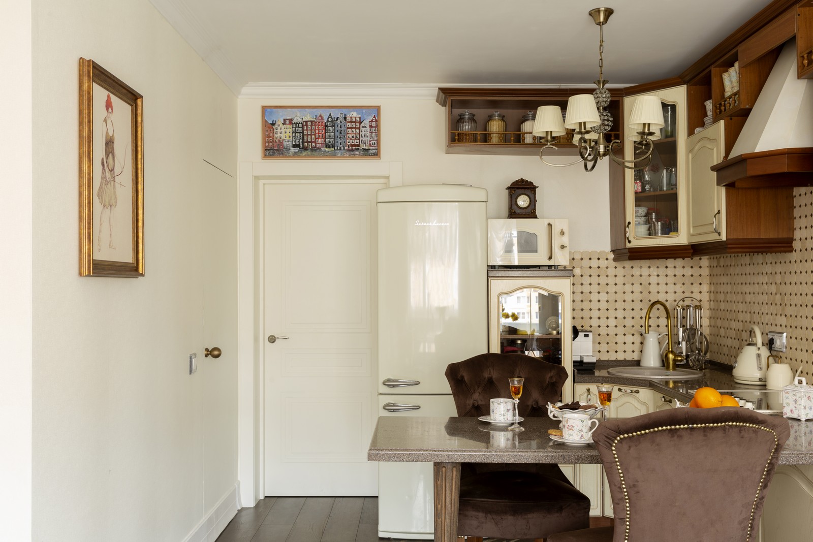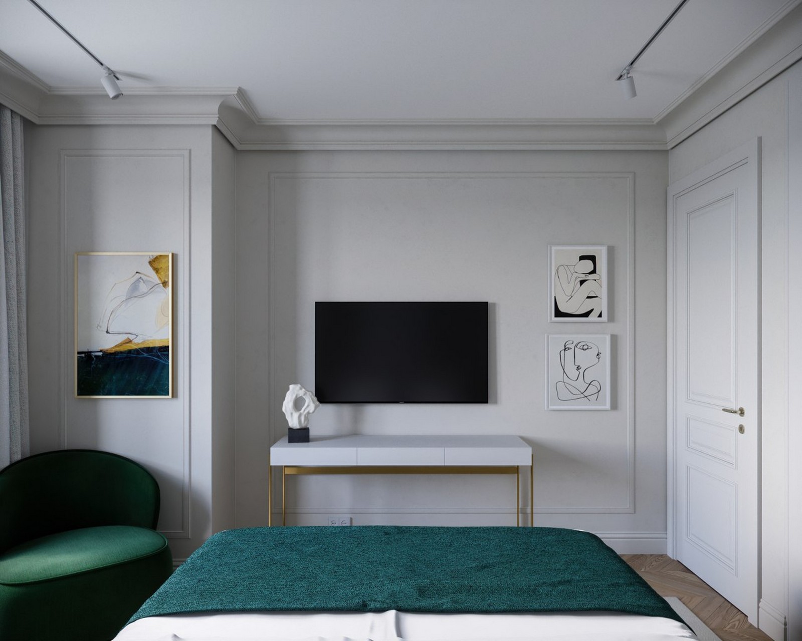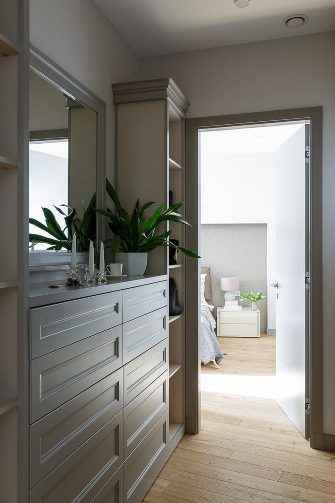 Обратите внимание на удачную находку дизайнера - роскошная классическая дверь VISCONTI практически сливается по цвету со стеной, границу обозначают лишь элегантные полоски золотой патины.