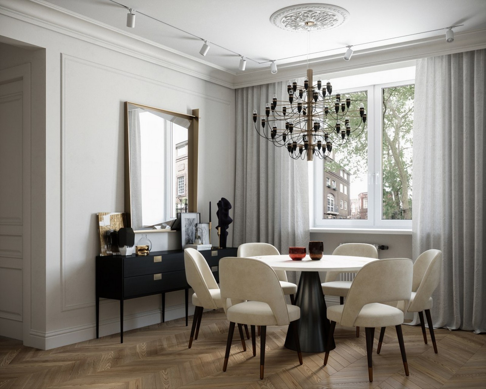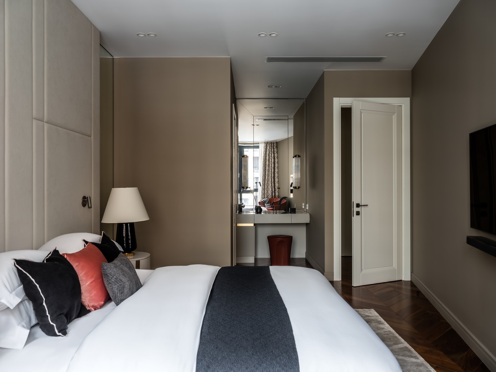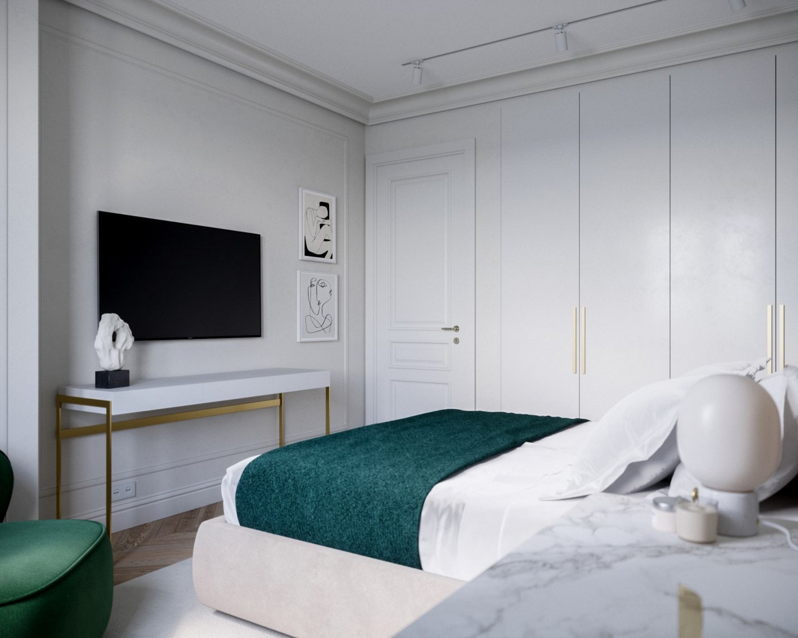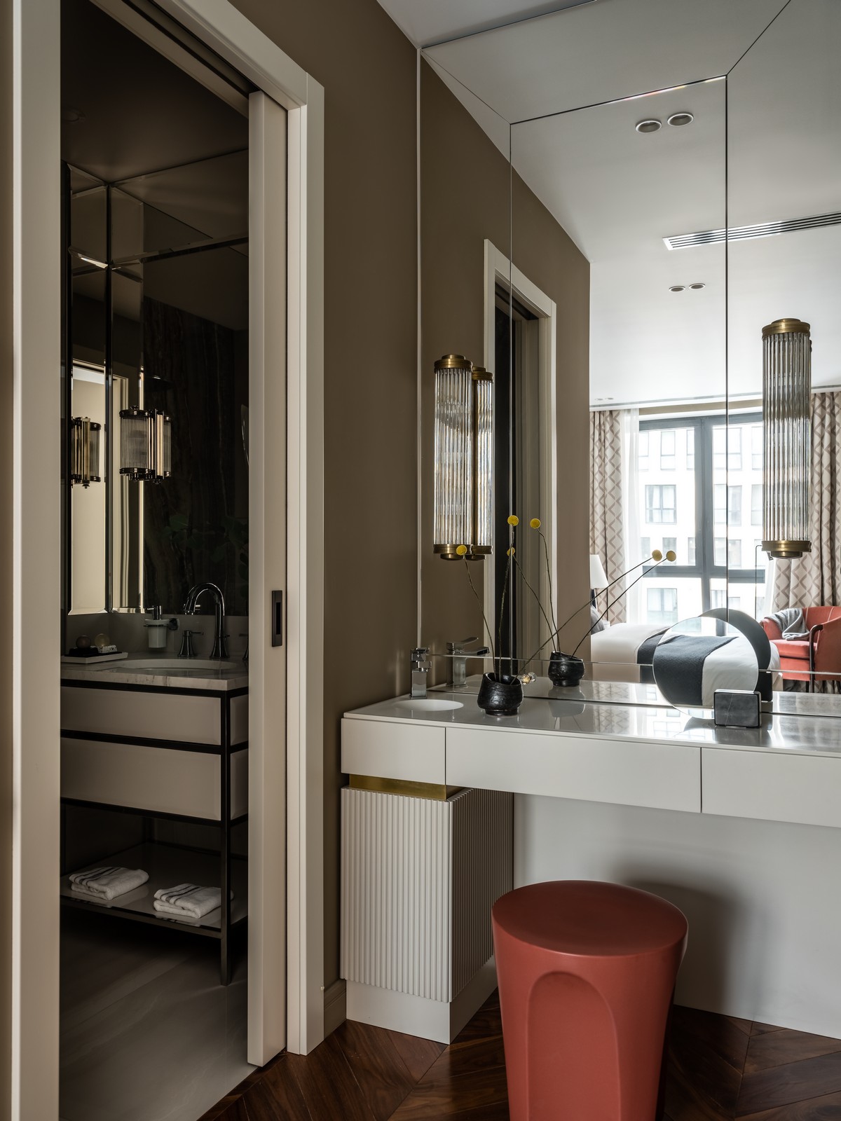 Обратите внимание на удачную находку дизайнера - роскошная классическая дверь VISCONTI практически сливается по цвету со стеной, границу обозначают лишь элегантные полоски золотой патины.