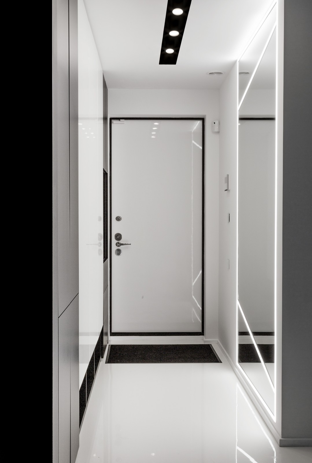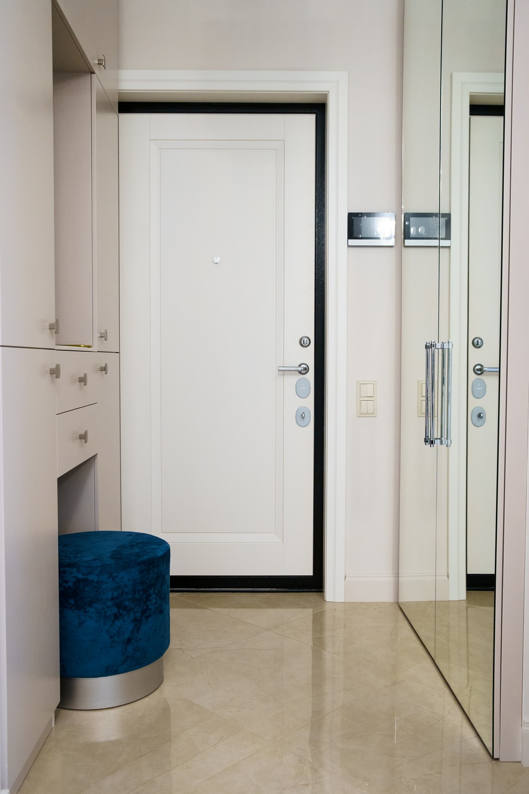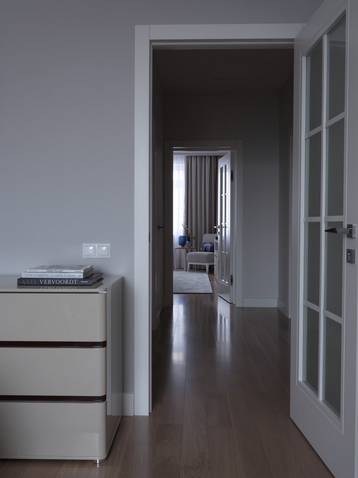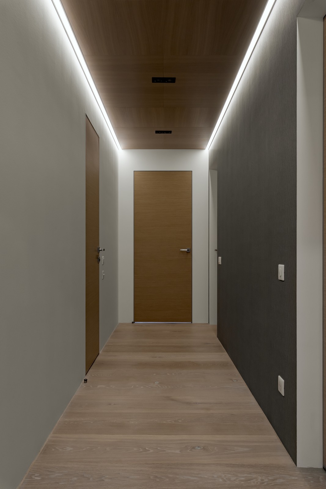 В квартире использовали двери компании DORIAN. На момент ремонта квартиры это была новинка. Фактурная поверхность дверных полотен привнесла сложность восприятие интерьера, а наличники из алюминия добавили элегантность.