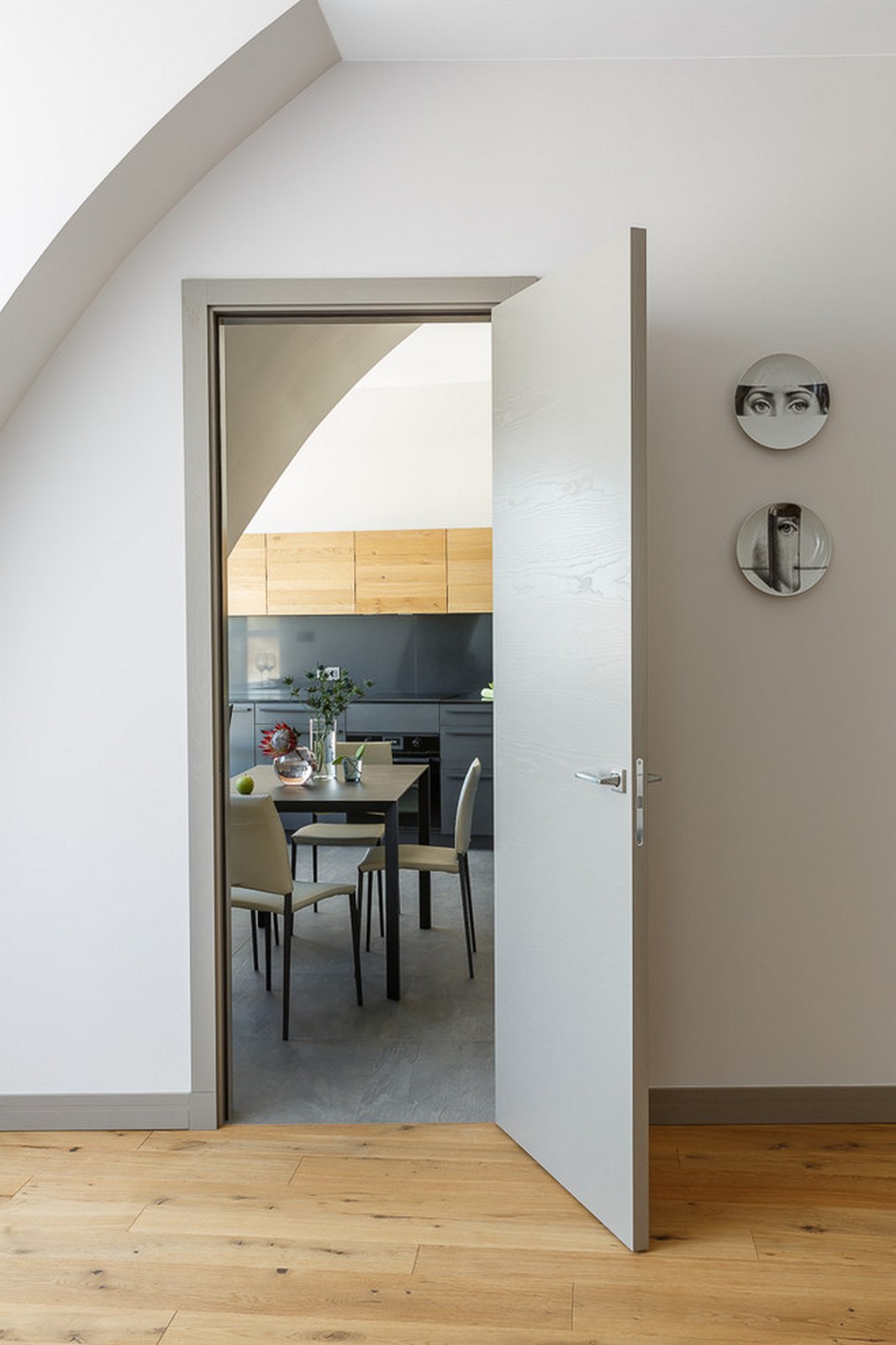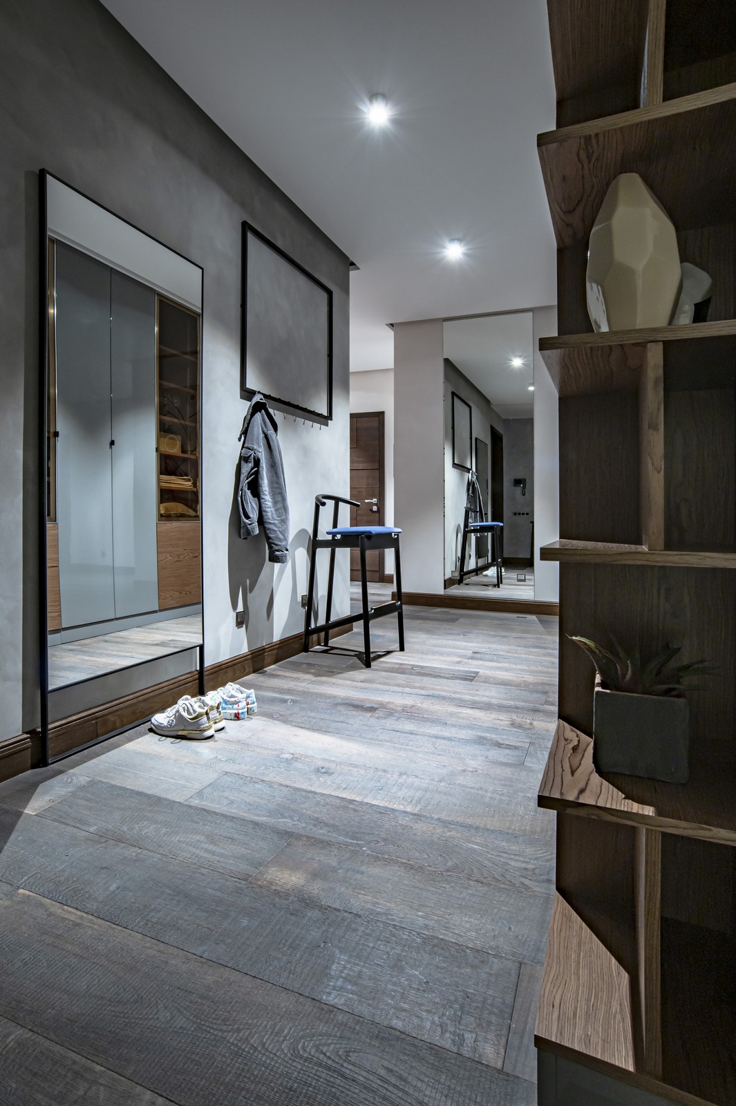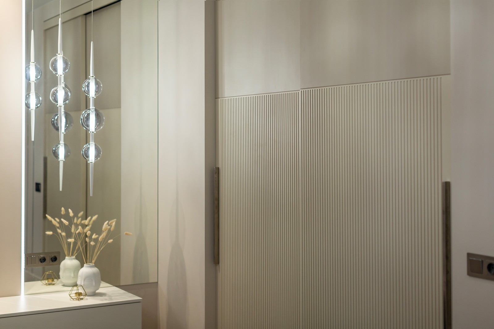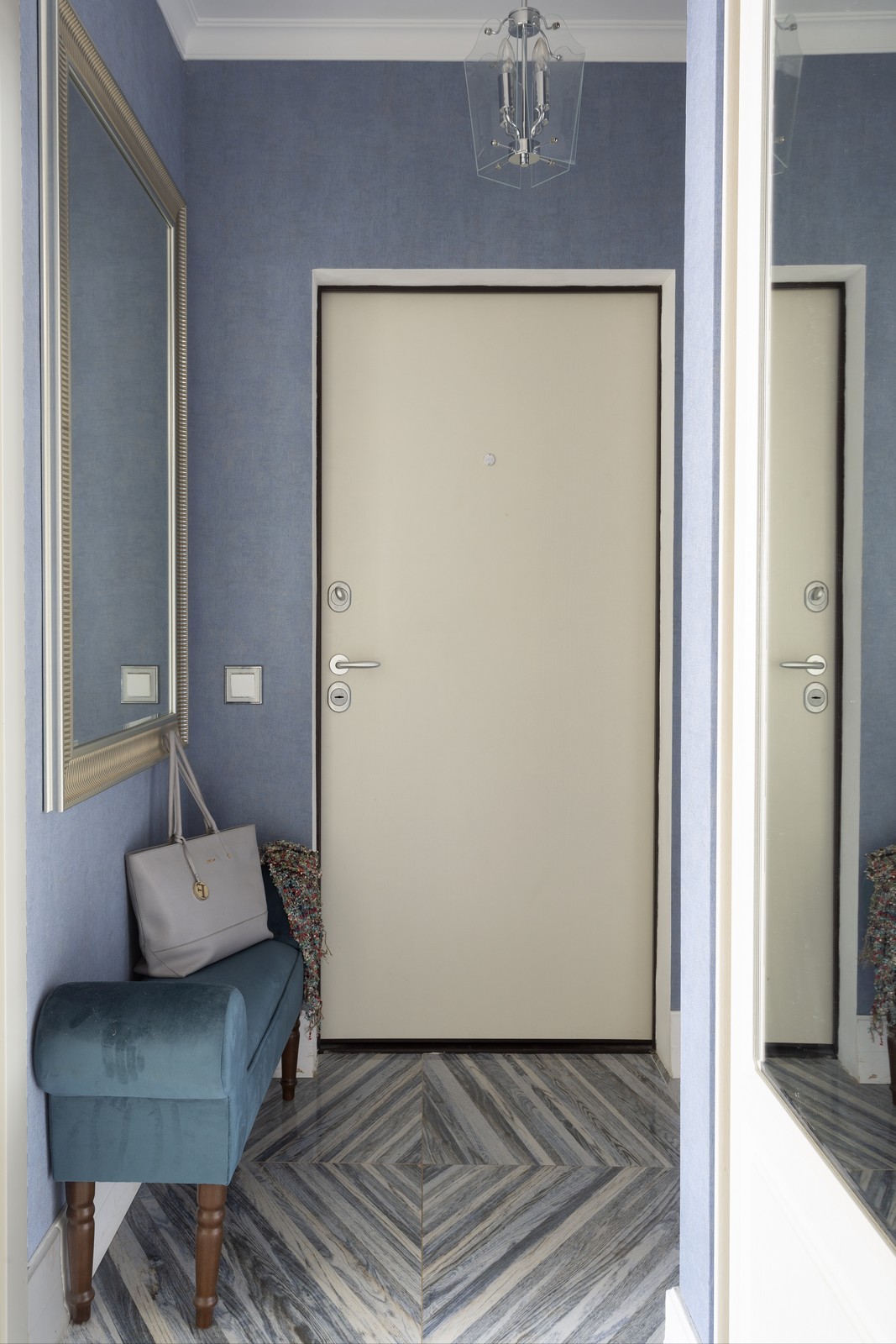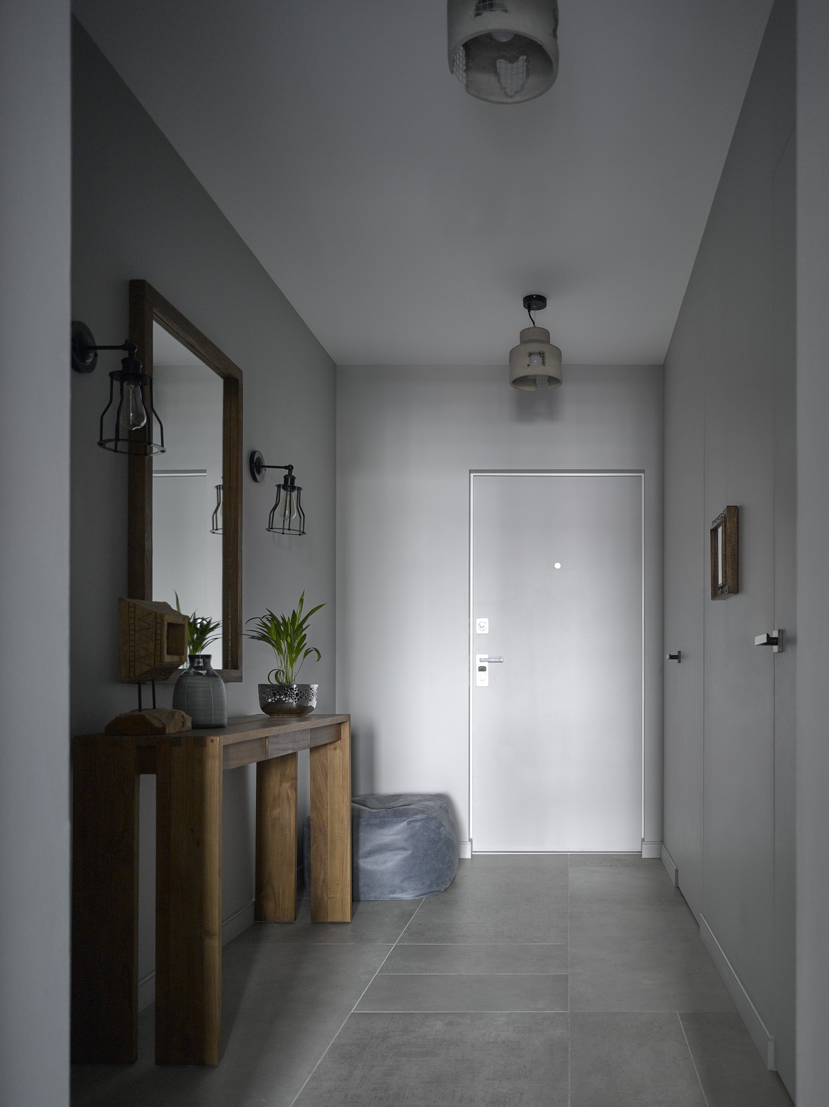 В квартире использовали двери компании DORIAN. На момент ремонта квартиры это была новинка. Фактурная поверхность дверных полотен привнесла сложность восприятие интерьера, а наличники из алюминия добавили элегантность.