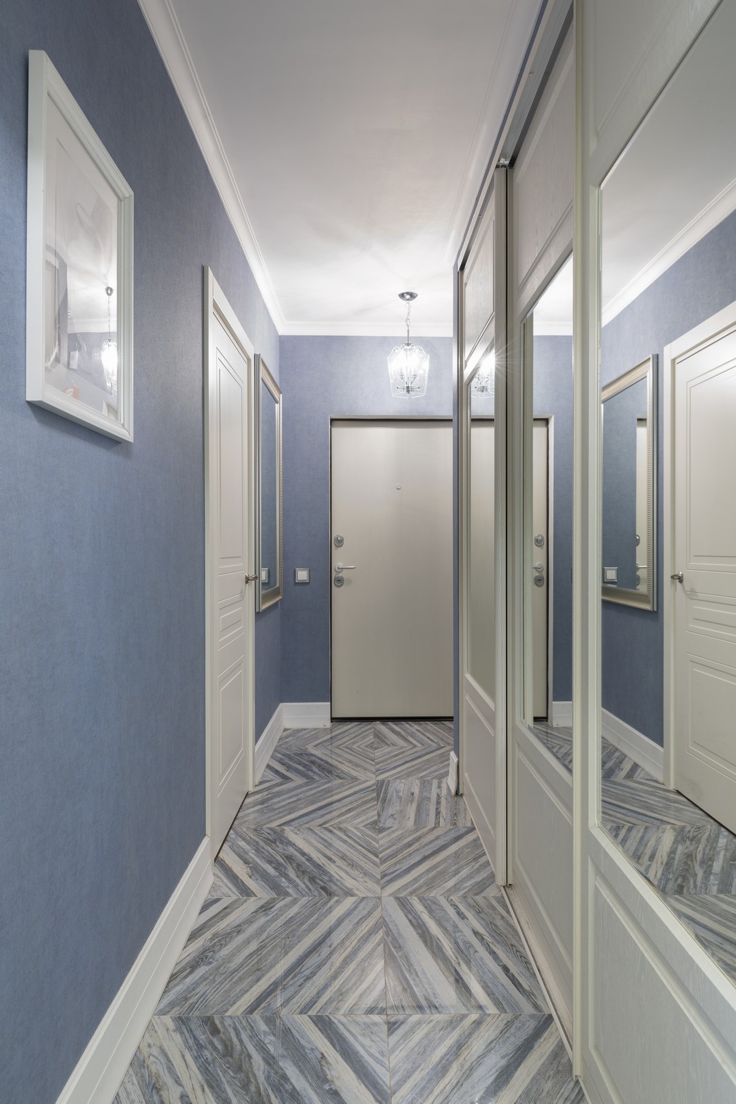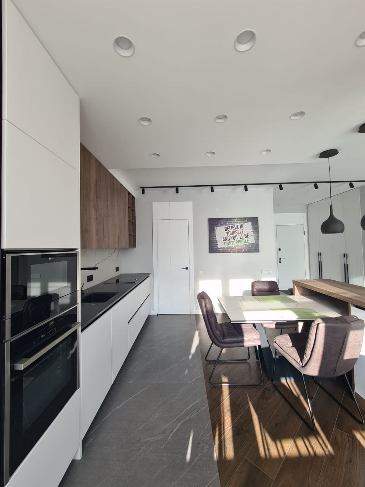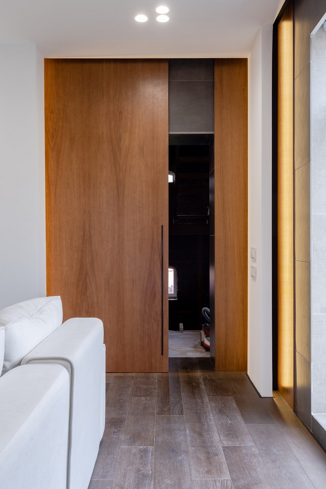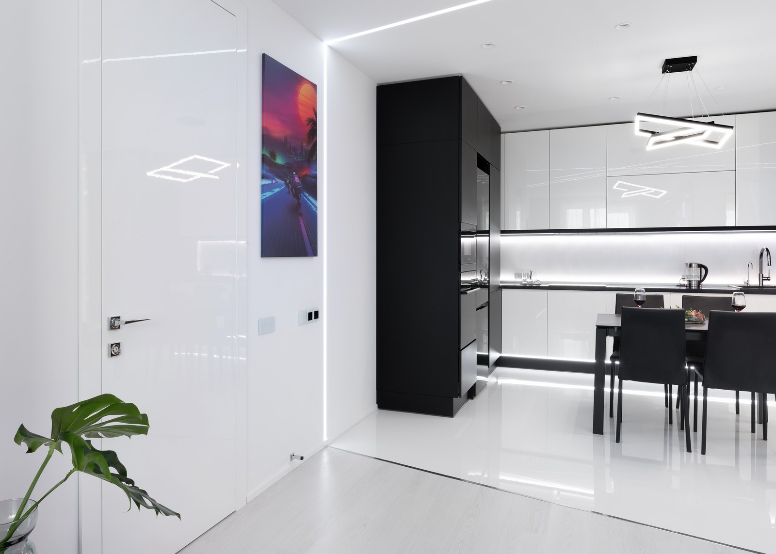 В квартире использовали двери компании DORIAN. На момент ремонта квартиры это была новинка. Фактурная поверхность дверных полотен привнесла сложность восприятие интерьера, а наличники из алюминия добавили элегантность.