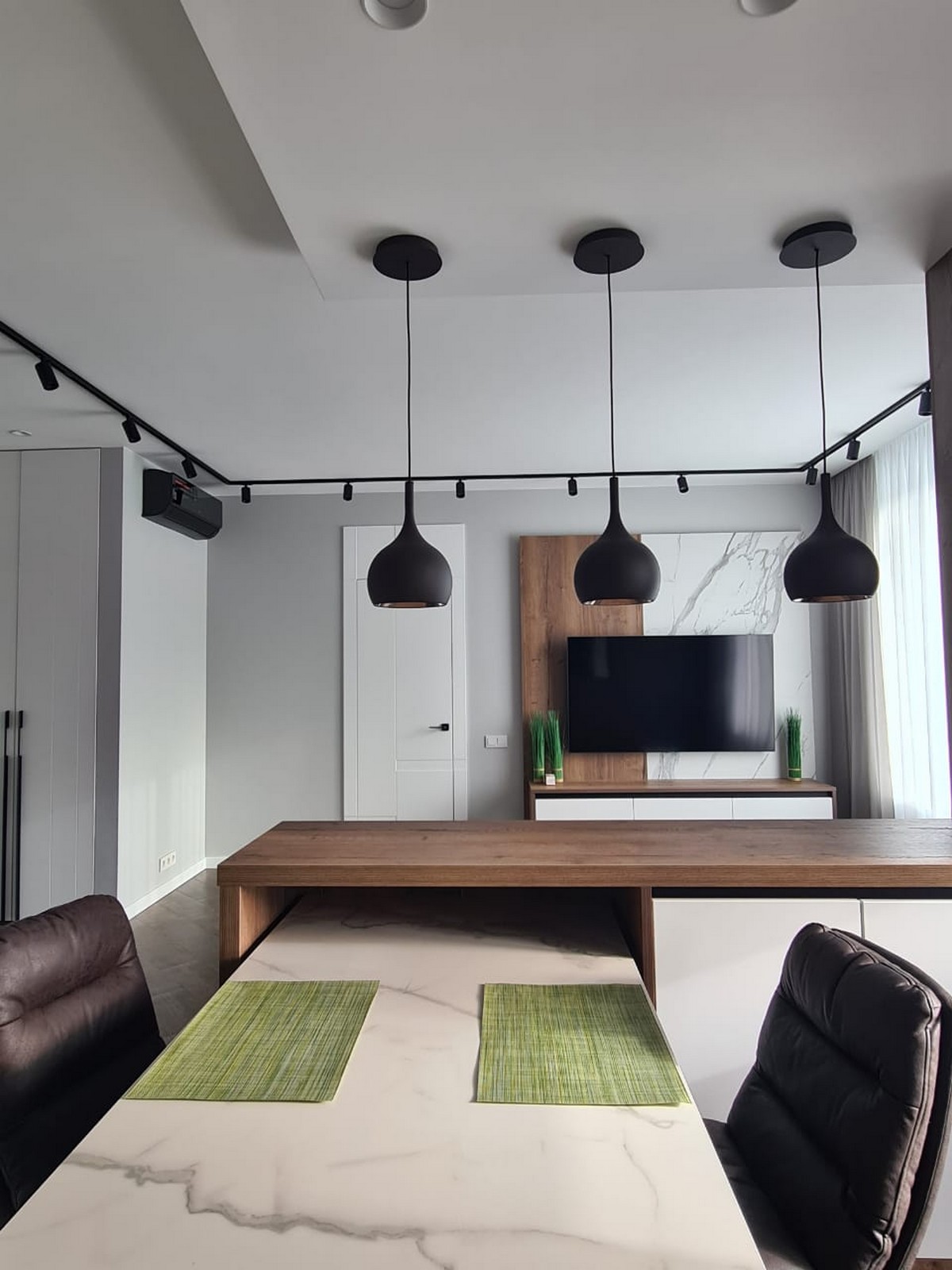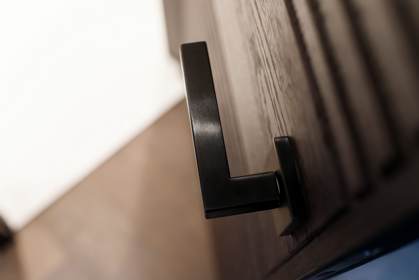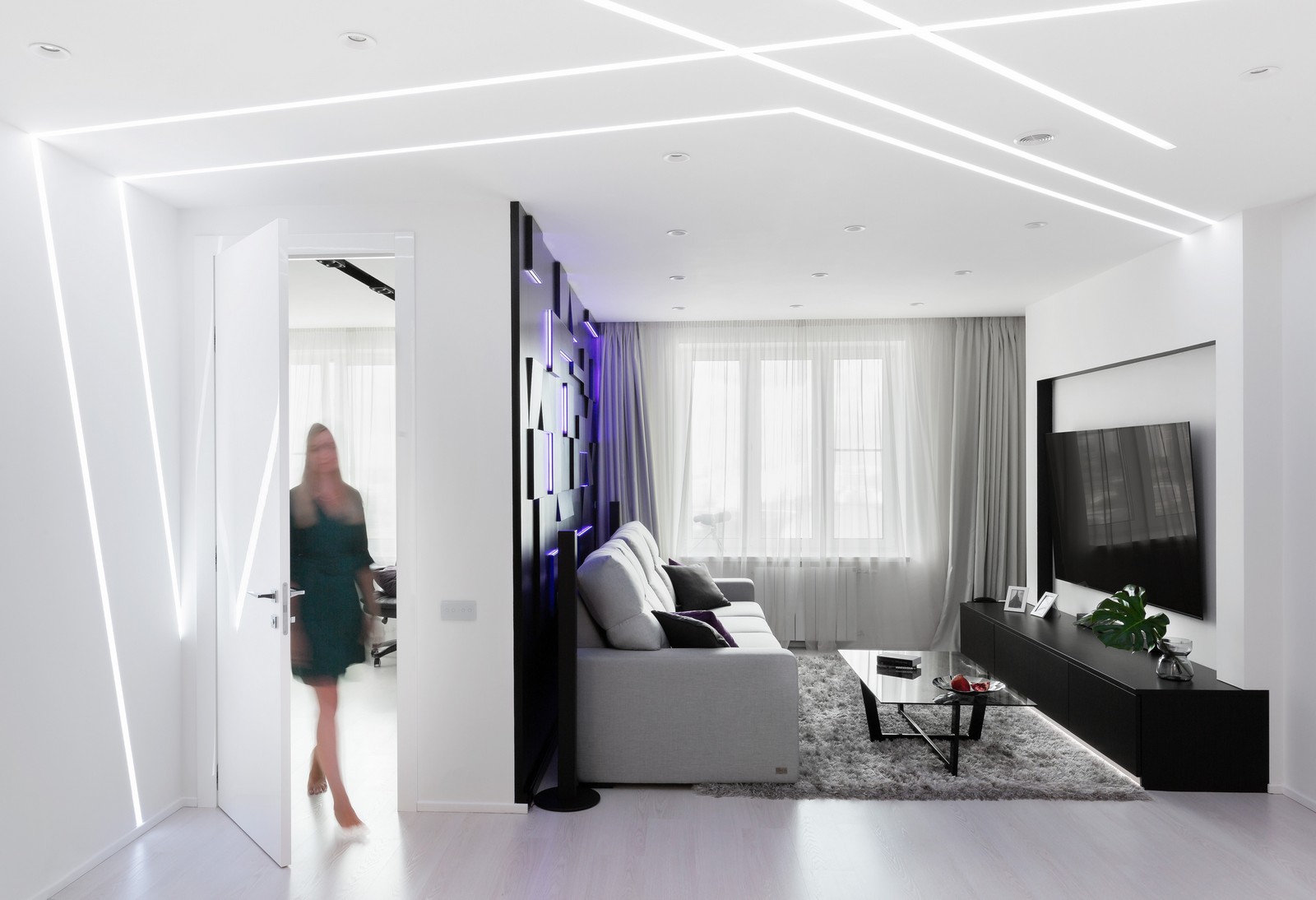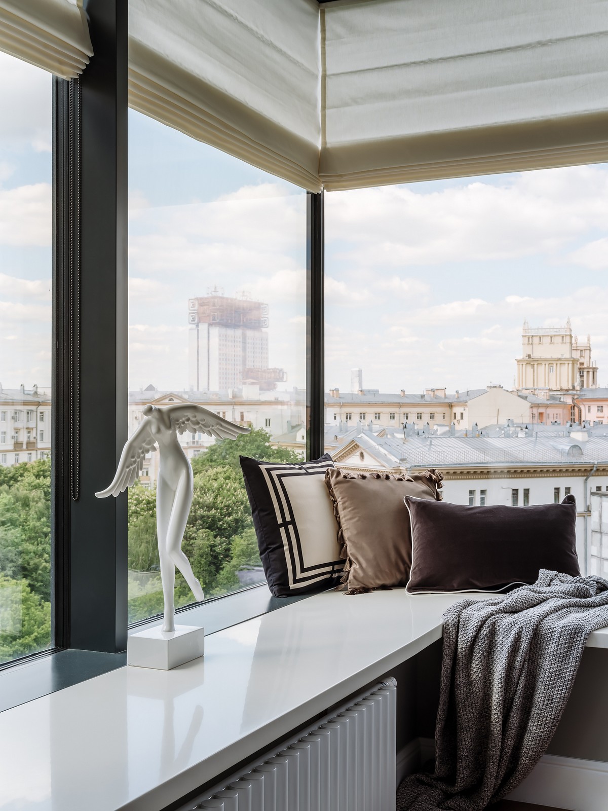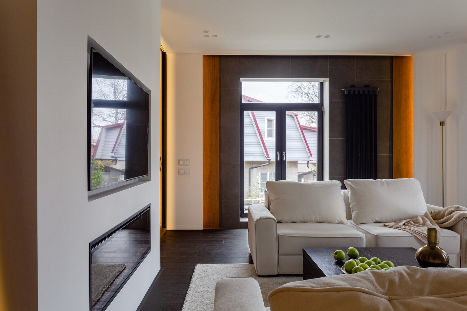 В квартире использовали двери компании DORIAN. На момент ремонта квартиры это была новинка. Фактурная поверхность дверных полотен привнесла сложность восприятие интерьера, а наличники из алюминия добавили элегантность.