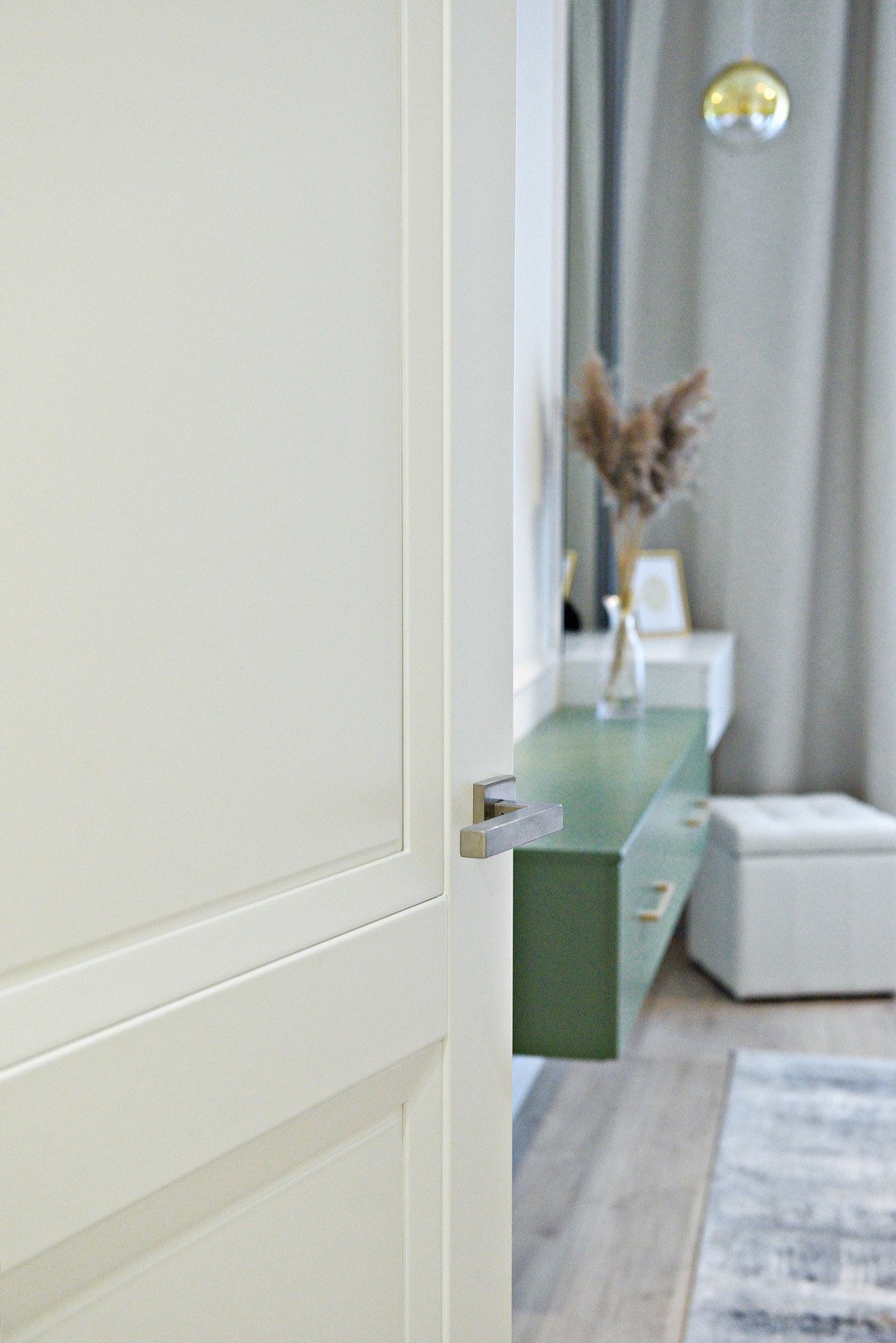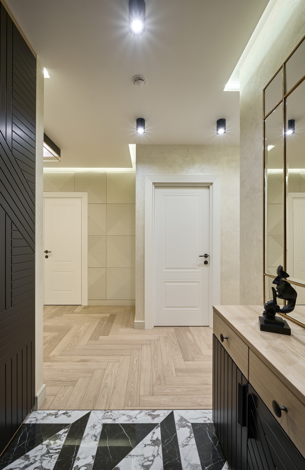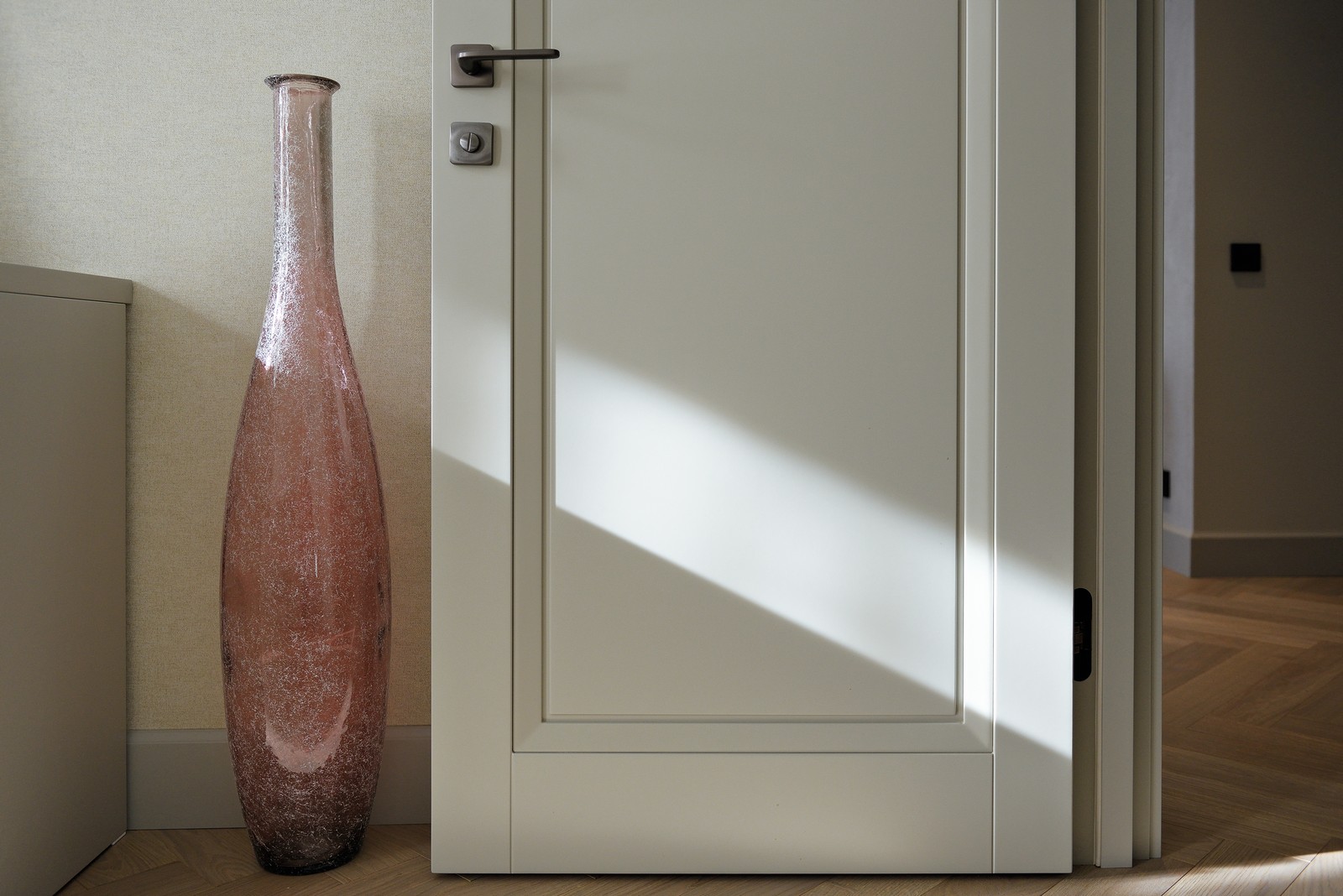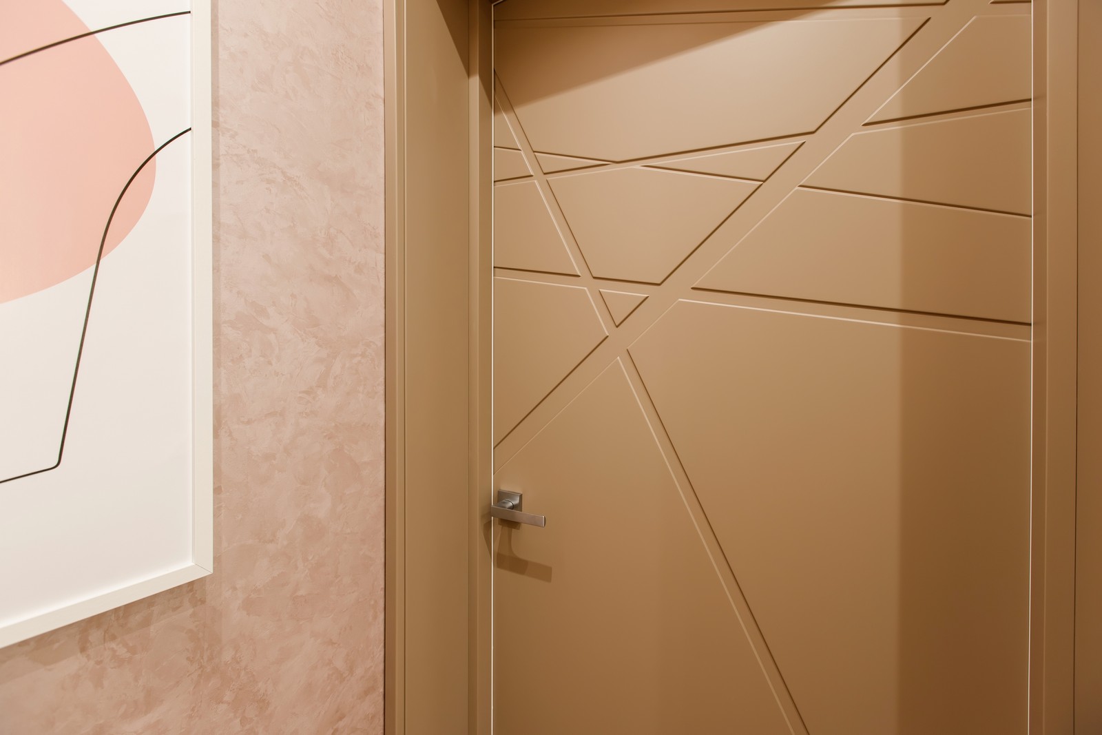 Квартира на Проспекте Вернадского от дизайнера Елены Мухачевой. Межкомнатные двери COLORE 80 с размашистым геометрическим рисунком, разработанные архитектурным бюро Stradivari Design эксклюзивно для DORIAN. Входная дверь оформлена в одном стиле с межкомнатными. Особый запрос дизайнера - некоторые двери должны быть окрашены сразу в два цвета. С одной стороны - в нежный кремовый, а с другой - в оттенок капучино. Причем не только полотна, но и дверные короба. Была проделана ювелирная работа - два цвета незаметно переходят один в другой, границу скрывает под собой уплотнитель на дверной коробке. И кофейное настроение с утра обеспечено!