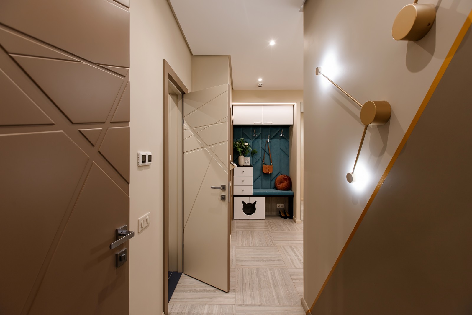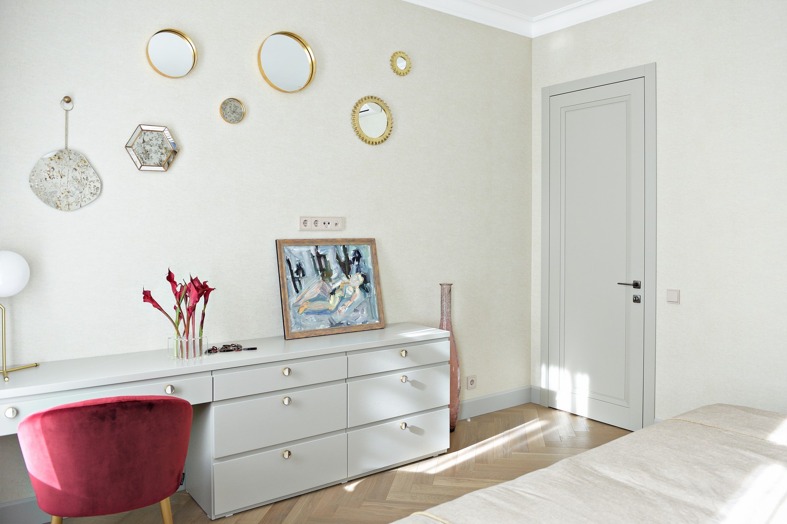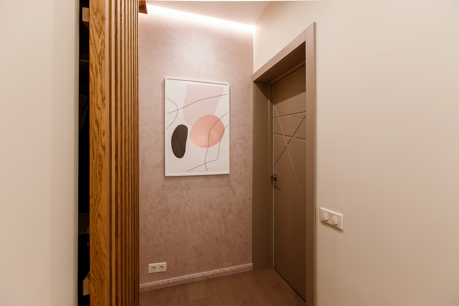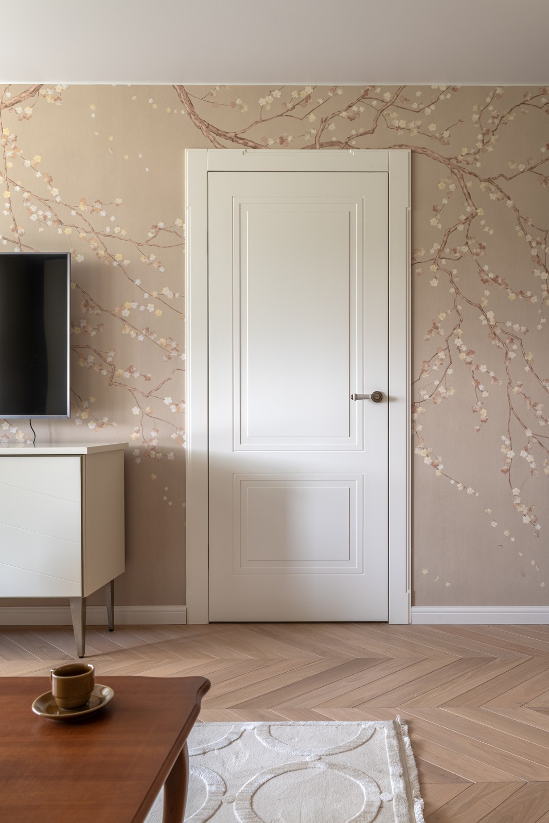 Квартира на Проспекте Вернадского от дизайнера Елены Мухачевой. Межкомнатные двери COLORE 80 с размашистым геометрическим рисунком, разработанные архитектурным бюро Stradivari Design эксклюзивно для DORIAN. Входная дверь оформлена в одном стиле с межкомнатными. Особый запрос дизайнера - некоторые двери должны быть окрашены сразу в два цвета. С одной стороны - в нежный кремовый, а с другой - в оттенок капучино. Причем не только полотна, но и дверные короба. Была проделана ювелирная работа - два цвета незаметно переходят один в другой, границу скрывает под собой уплотнитель на дверной коробке. И кофейное настроение с утра обеспечено!