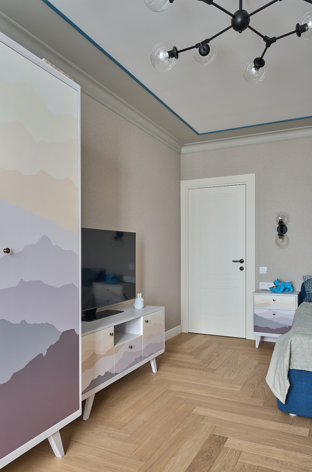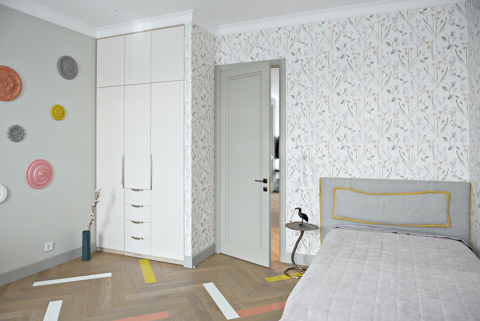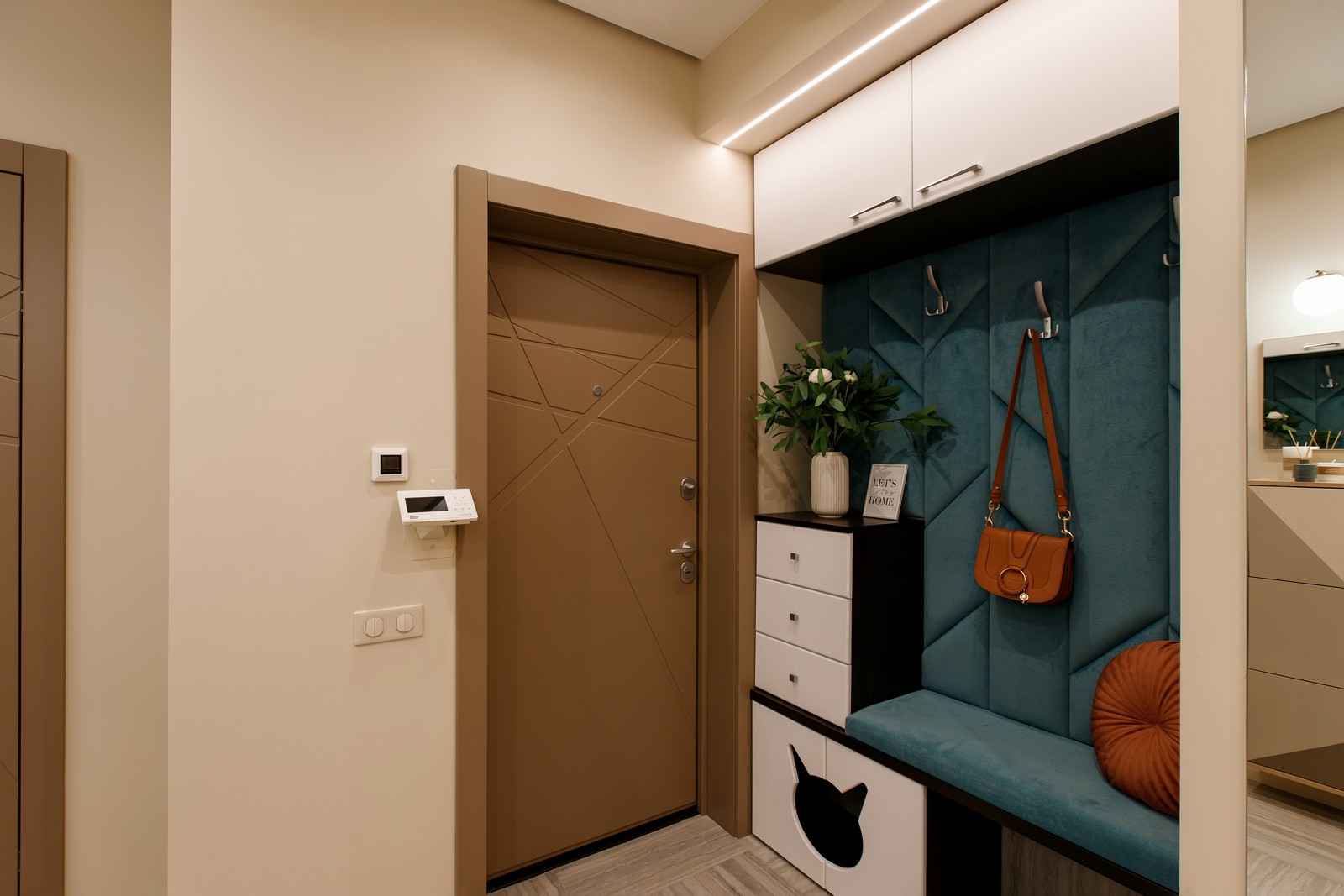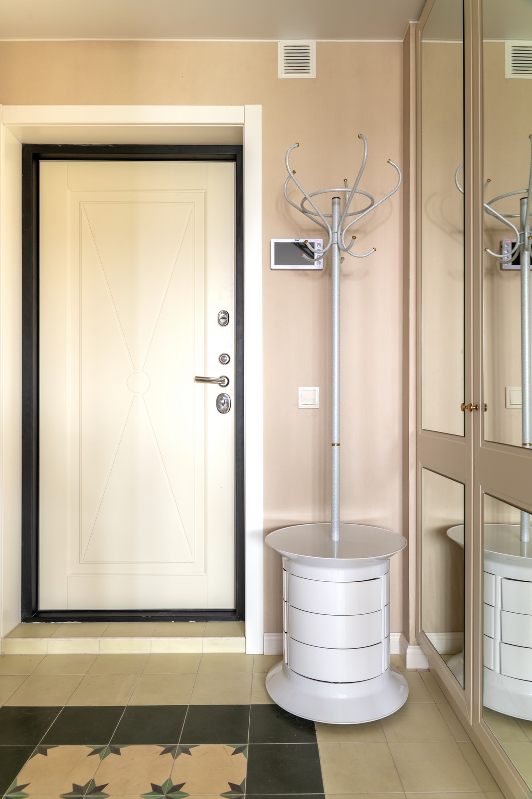 Квартира на Проспекте Вернадского от дизайнера Елены Мухачевой. Межкомнатные двери COLORE 80 с размашистым геометрическим рисунком, разработанные архитектурным бюро Stradivari Design эксклюзивно для DORIAN. Входная дверь оформлена в одном стиле с межкомнатными. Особый запрос дизайнера - некоторые двери должны быть окрашены сразу в два цвета. С одной стороны - в нежный кремовый, а с другой - в оттенок капучино. Причем не только полотна, но и дверные короба. Была проделана ювелирная работа - два цвета незаметно переходят один в другой, границу скрывает под собой уплотнитель на дверной коробке. И кофейное настроение с утра обеспечено!