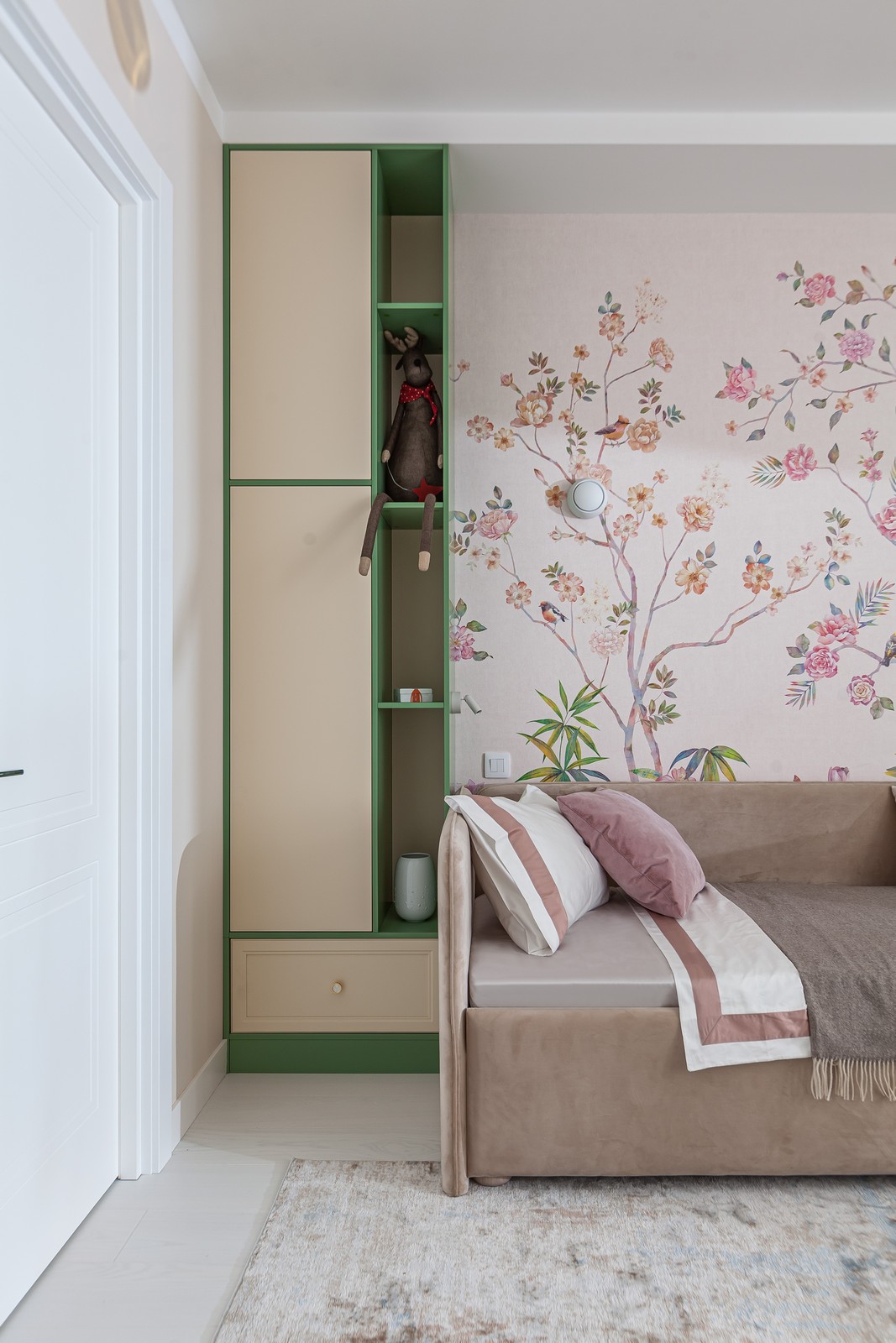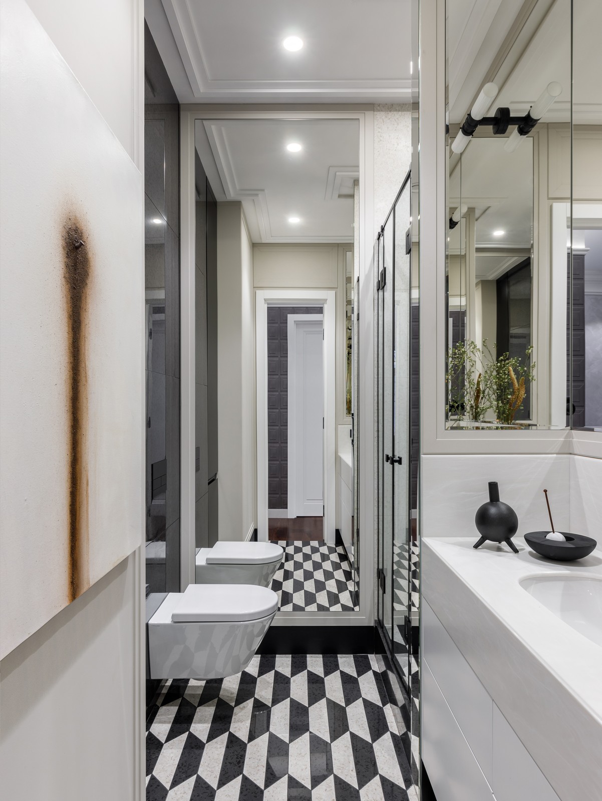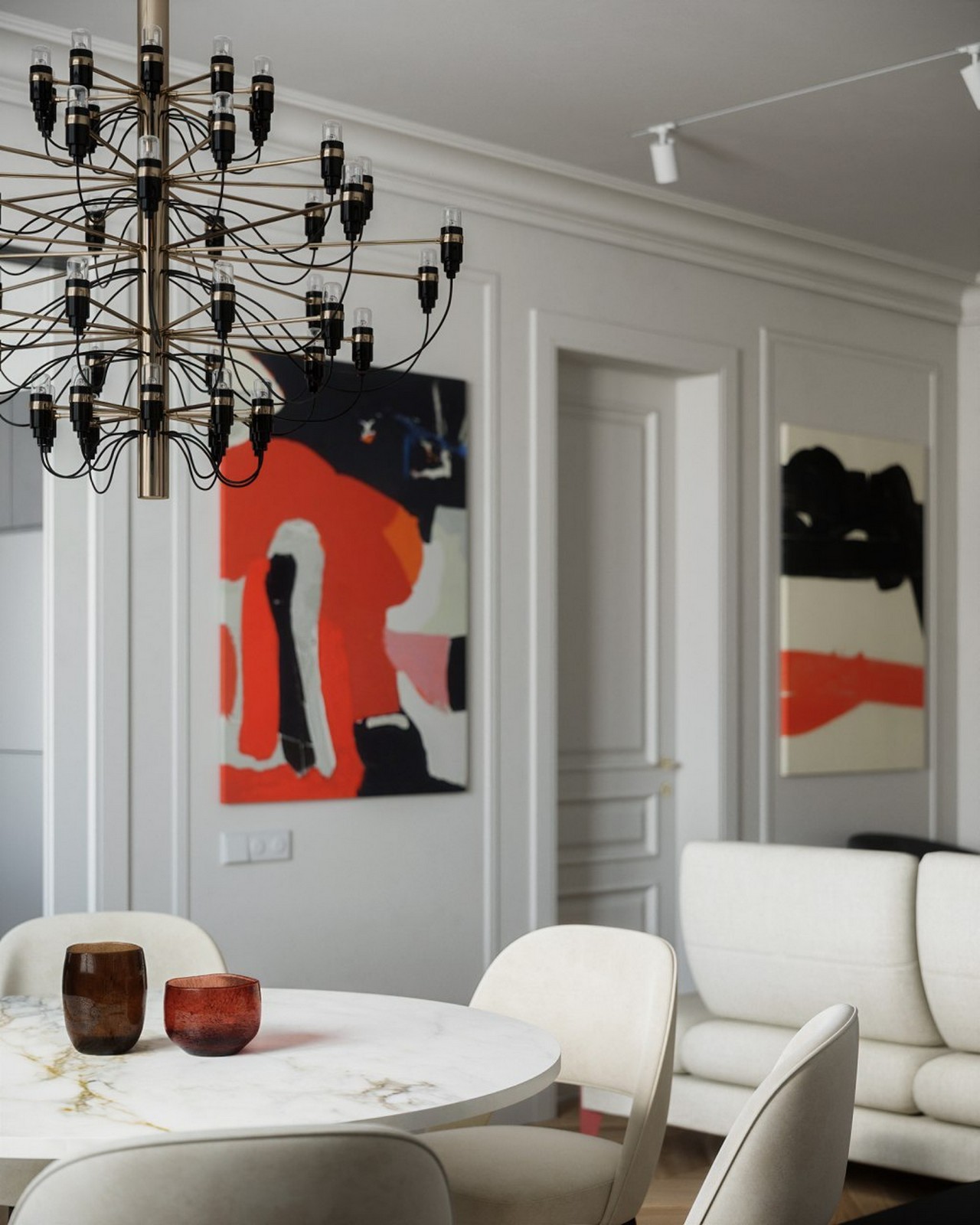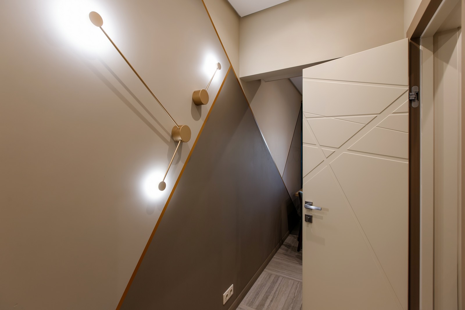 Квартира на Проспекте Вернадского от дизайнера Елены Мухачевой. Межкомнатные двери COLORE 80 с размашистым геометрическим рисунком, разработанные архитектурным бюро Stradivari Design эксклюзивно для DORIAN. Входная дверь оформлена в одном стиле с межкомнатными. Особый запрос дизайнера - некоторые двери должны быть окрашены сразу в два цвета. С одной стороны - в нежный кремовый, а с другой - в оттенок капучино. Причем не только полотна, но и дверные короба. Была проделана ювелирная работа - два цвета незаметно переходят один в другой, границу скрывает под собой уплотнитель на дверной коробке. И кофейное настроение с утра обеспечено!