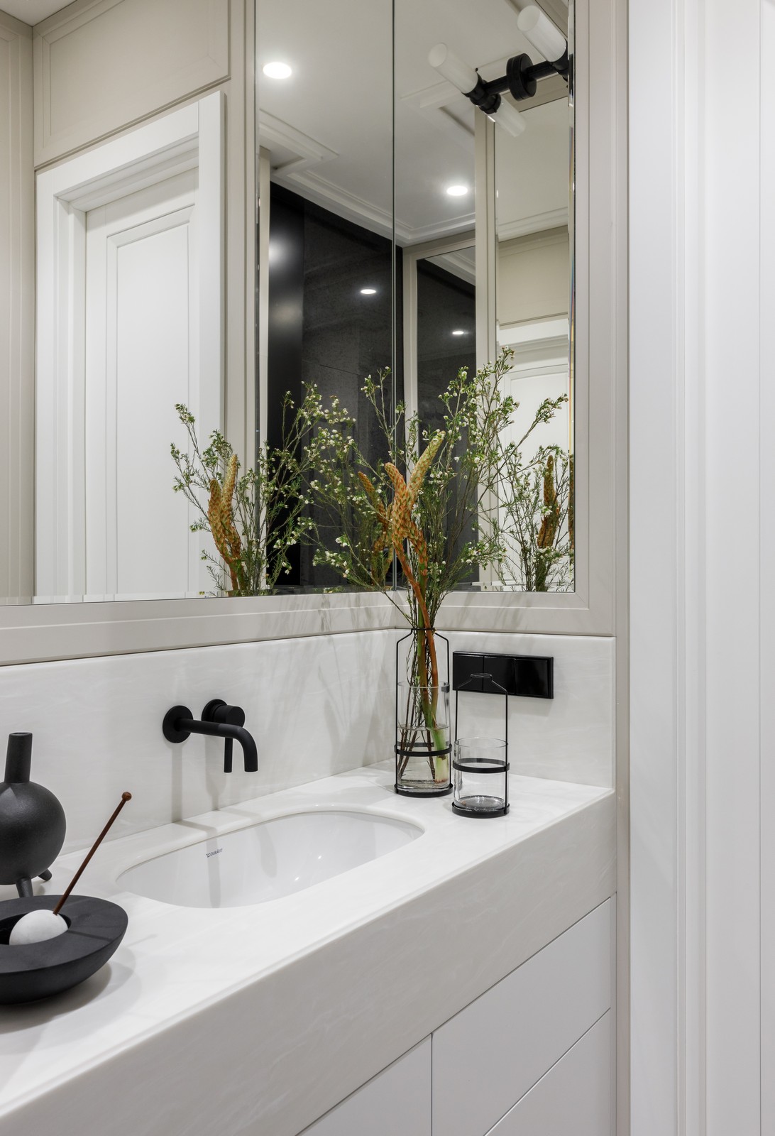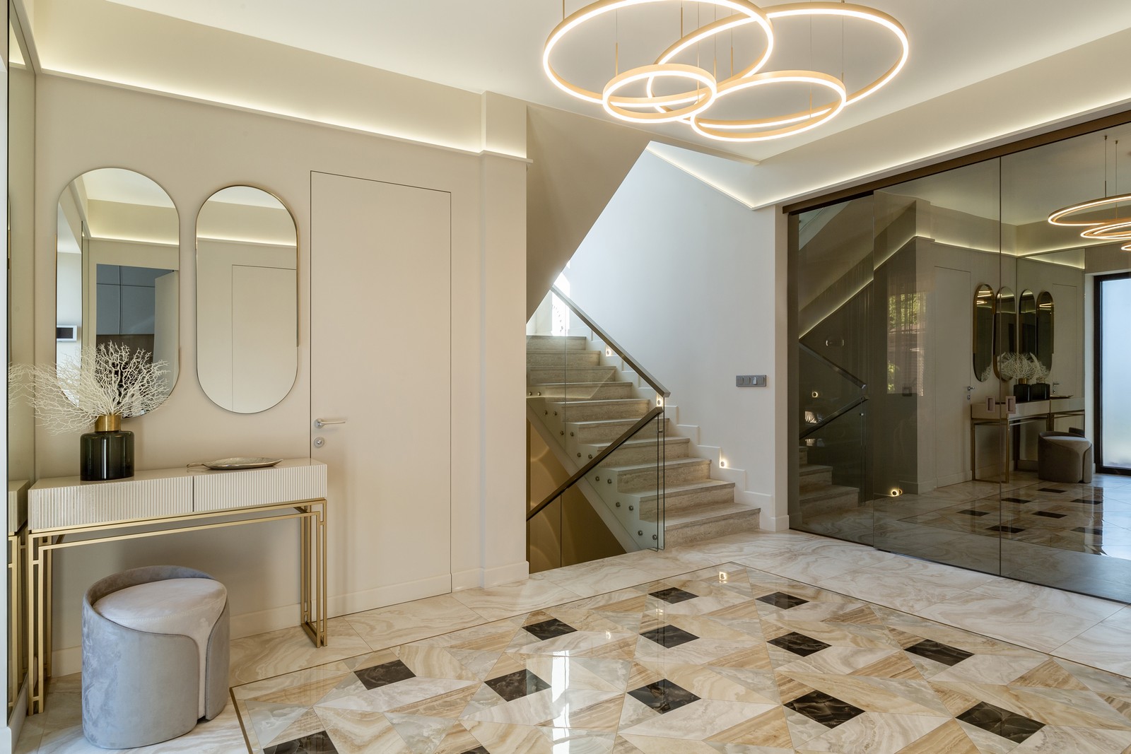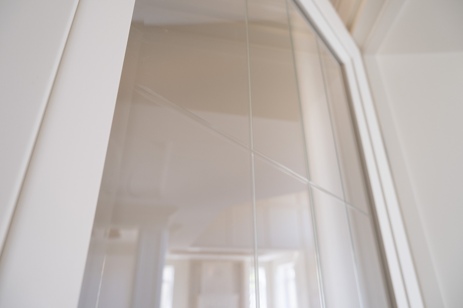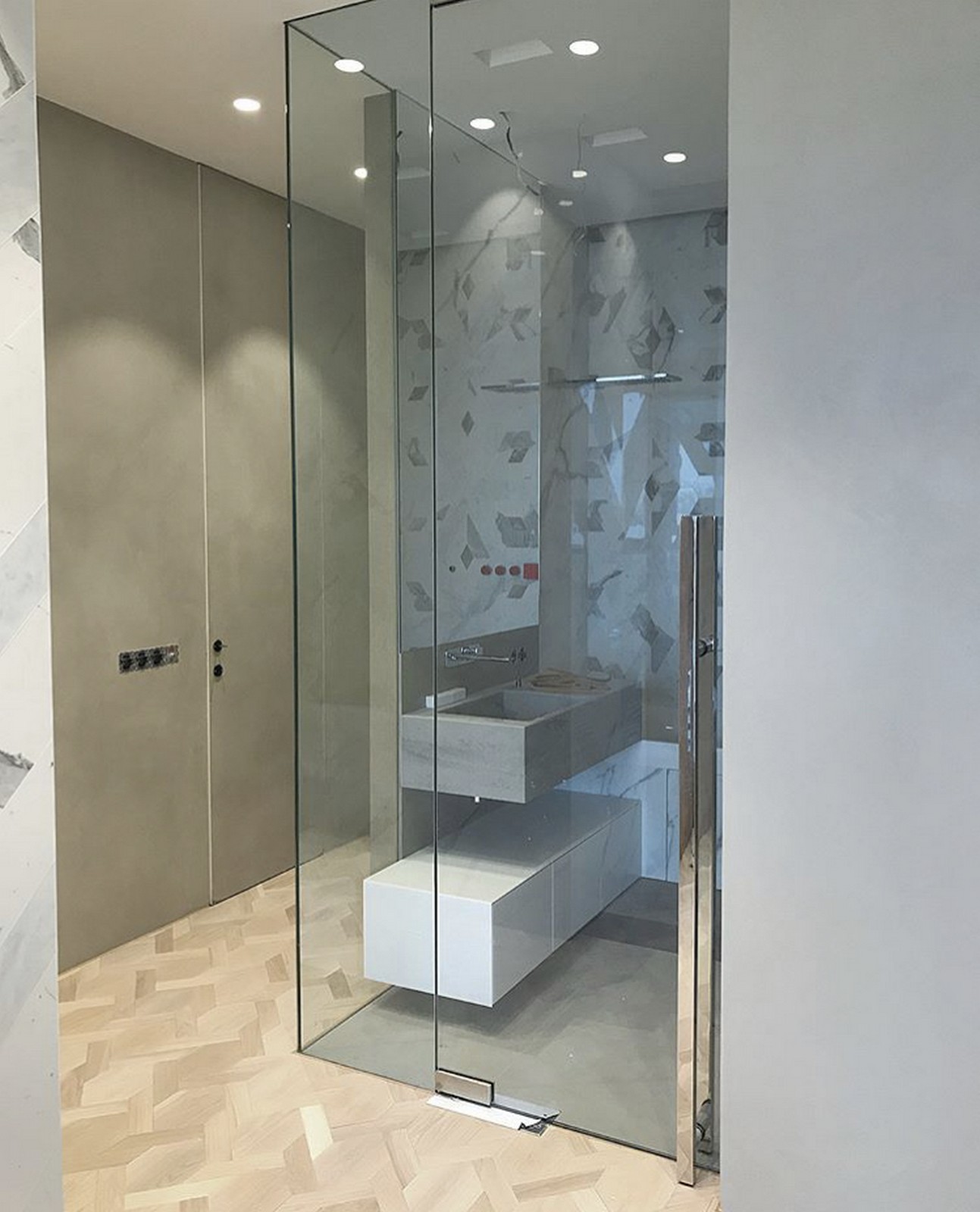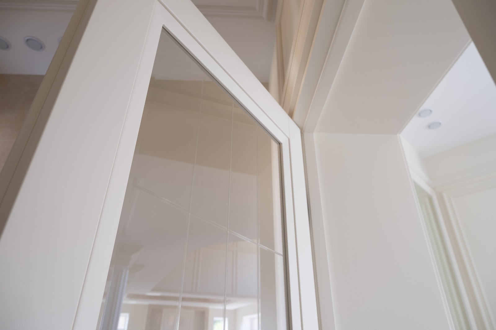 Загородная резиденция в Подмосковье. Изюминка этого проекта - эмалевые двери OPERA с большим прозрачным стеклом с гравировкой. В сочетании с большими зеркальными поверхностями на стеках они придает интерьеру легкости и изящества. Изготовление таких дверей требует особого мастерства - ведь сквозь прозрачное стекло видны все внутренние пазы двери, а значит они также должны быть идеально подготовлены и окрашены.