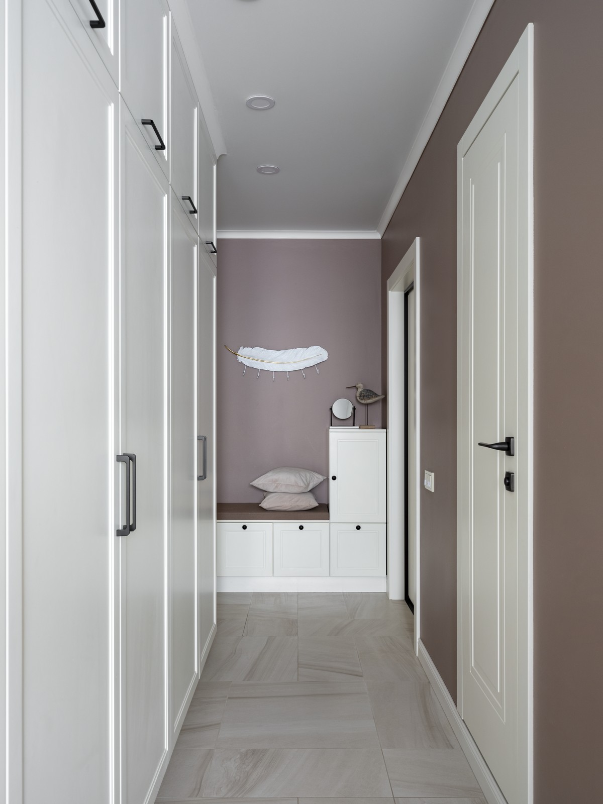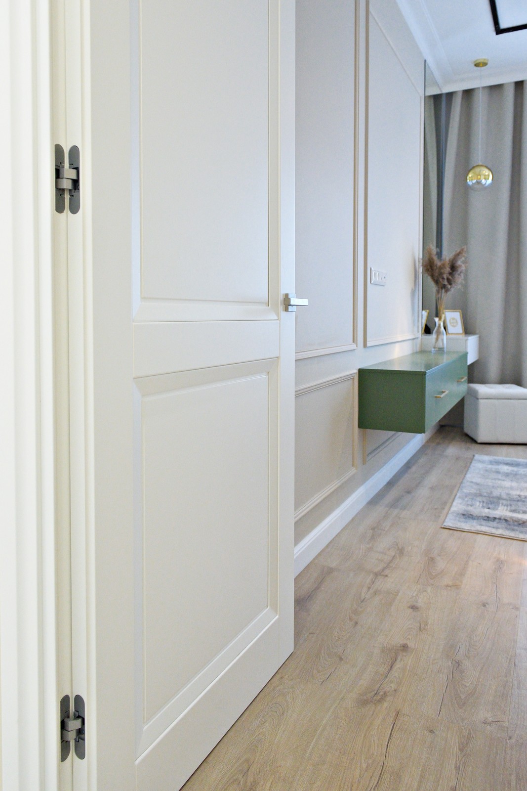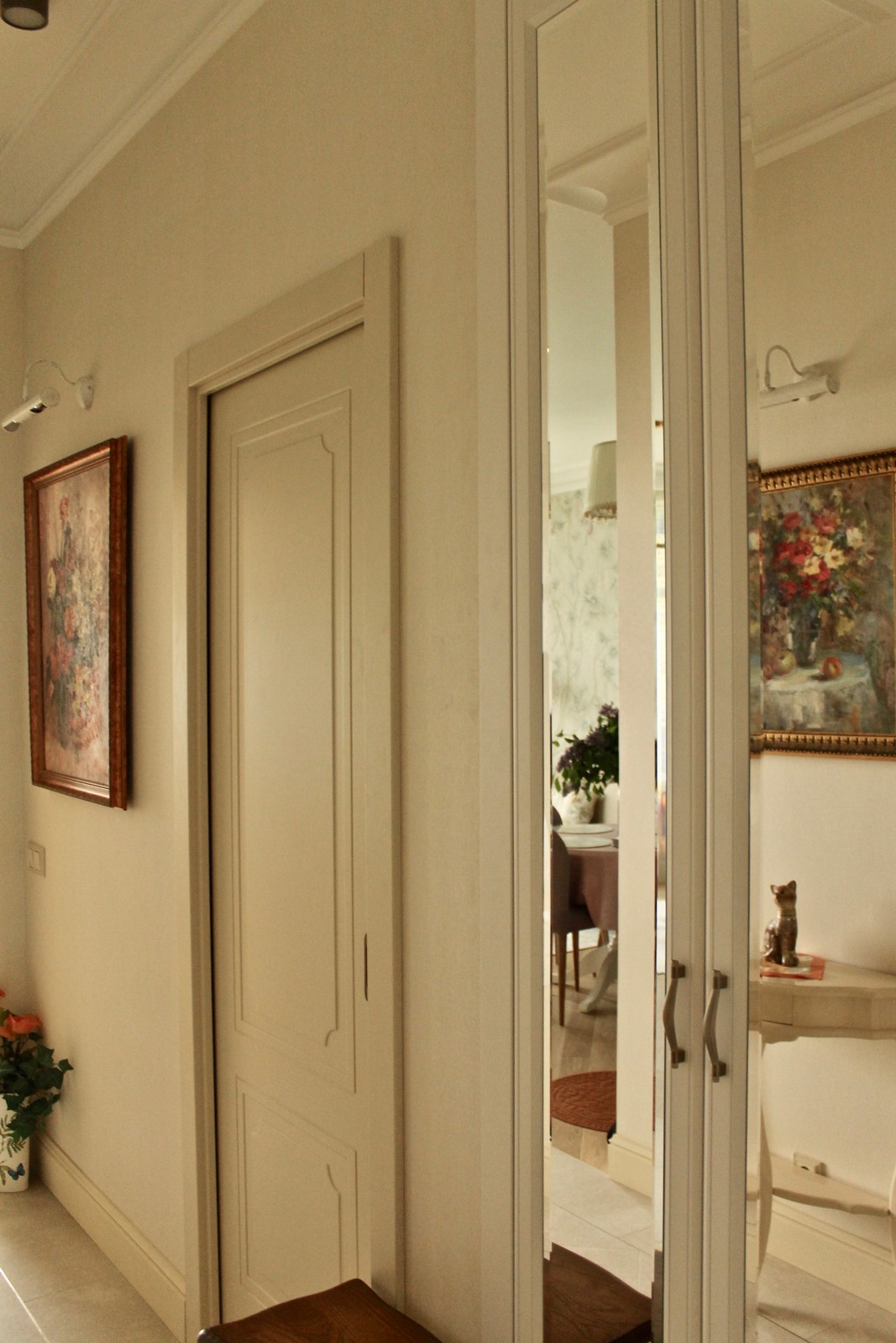 Проект дизайнера Лилит Агамаловой. "Ушки" на филенках делают модель VERONA 17 чуть более классической. Для этого объекта мы также изготовили дверцы для шкафа и панель на входную дверь в одном стиле с межкомнатными дверьми.
