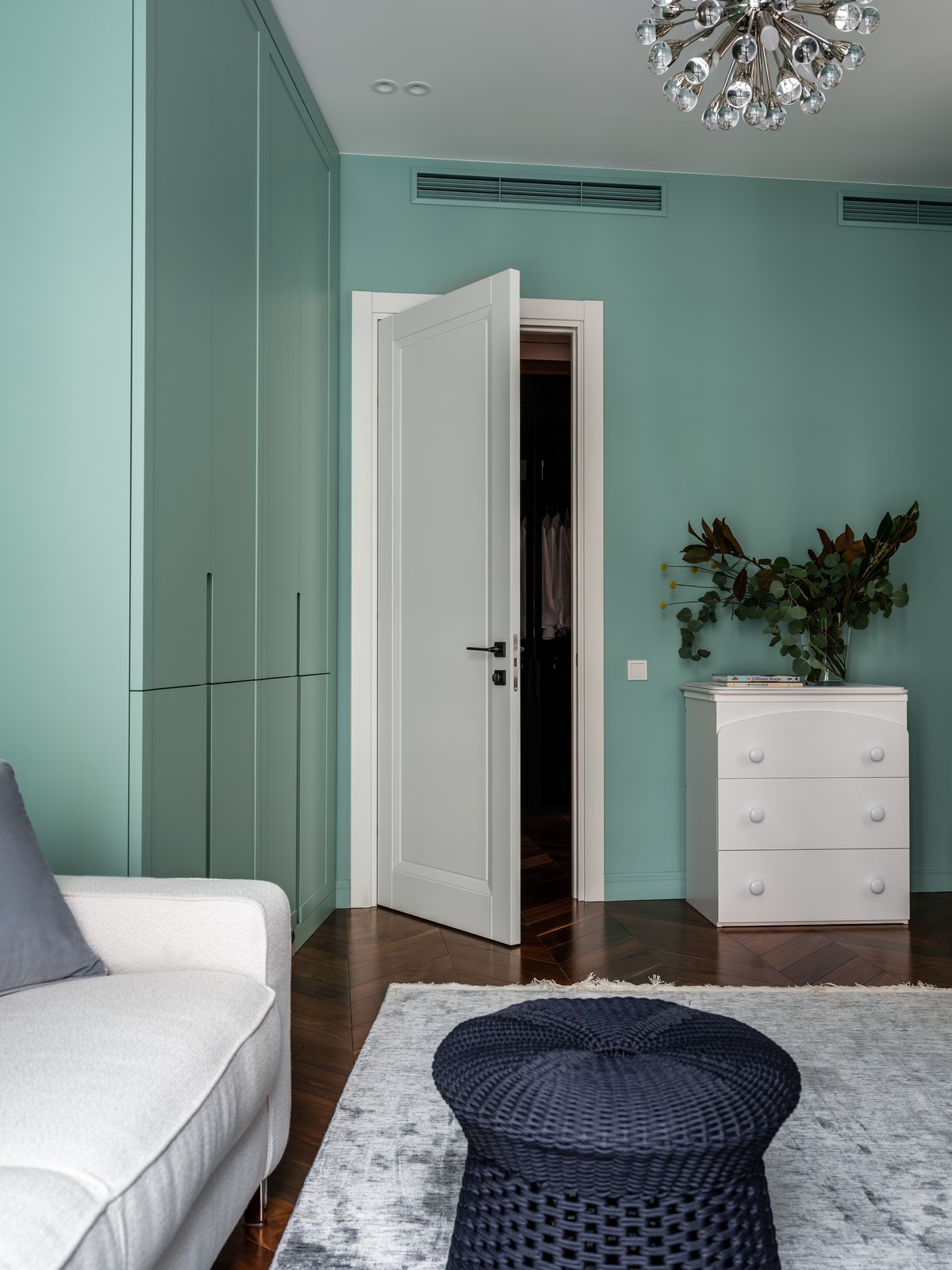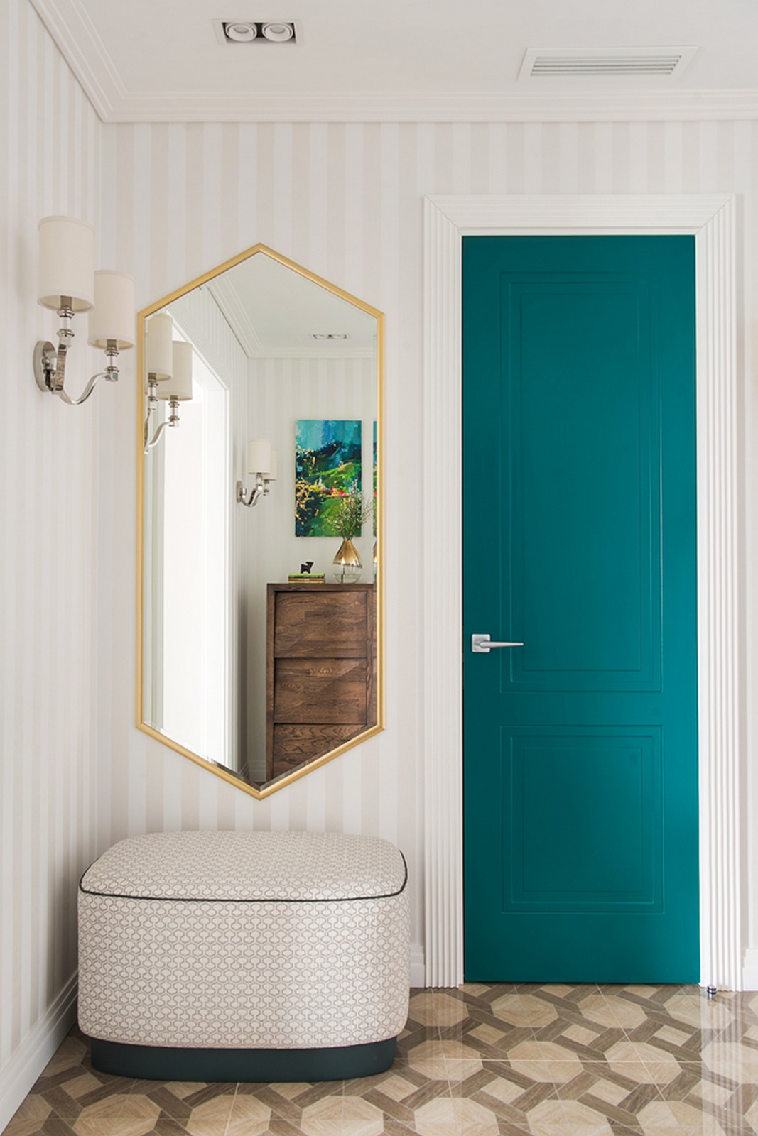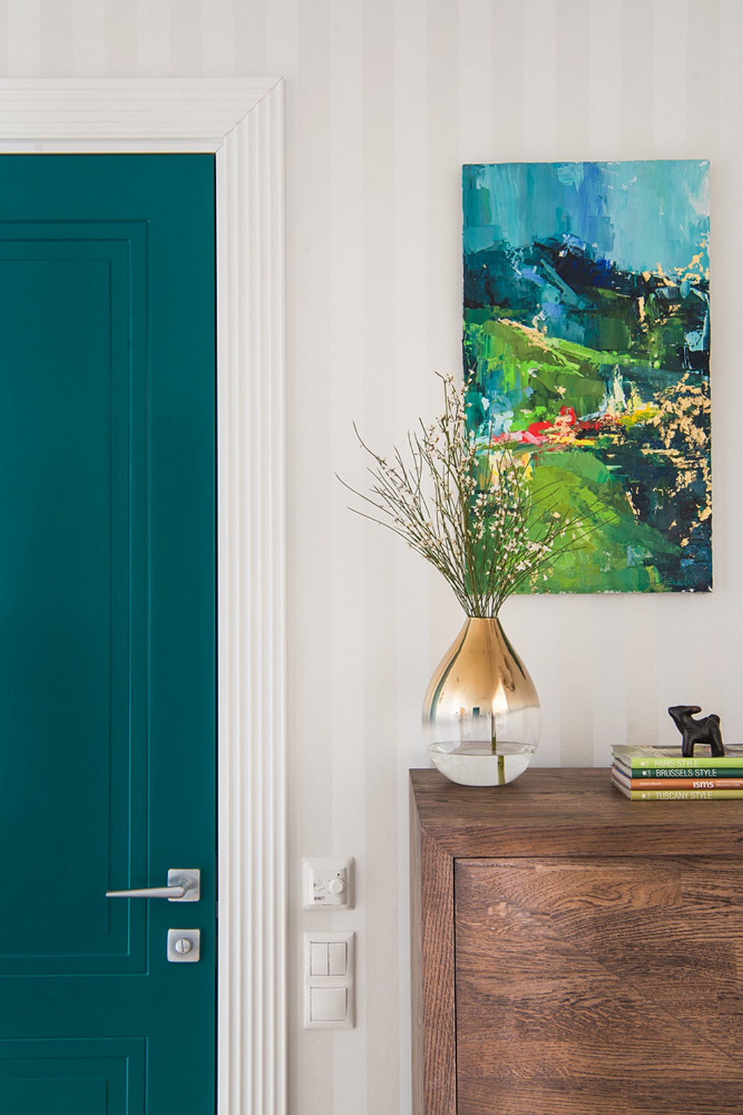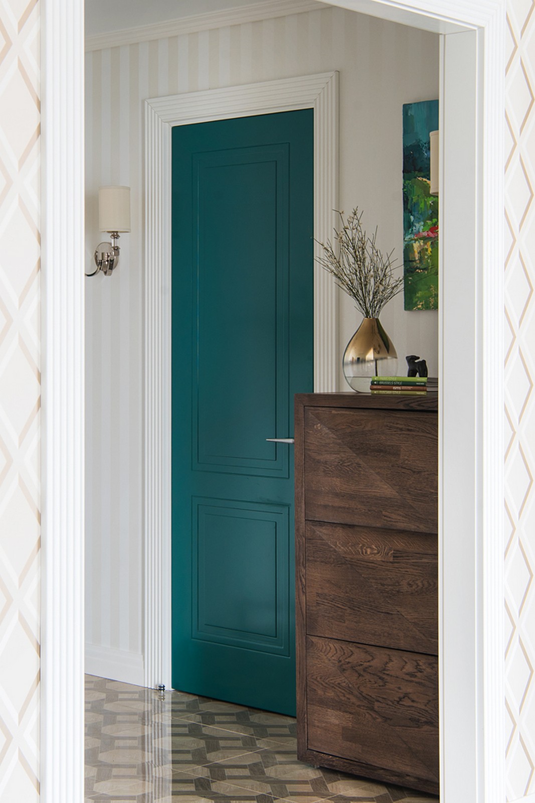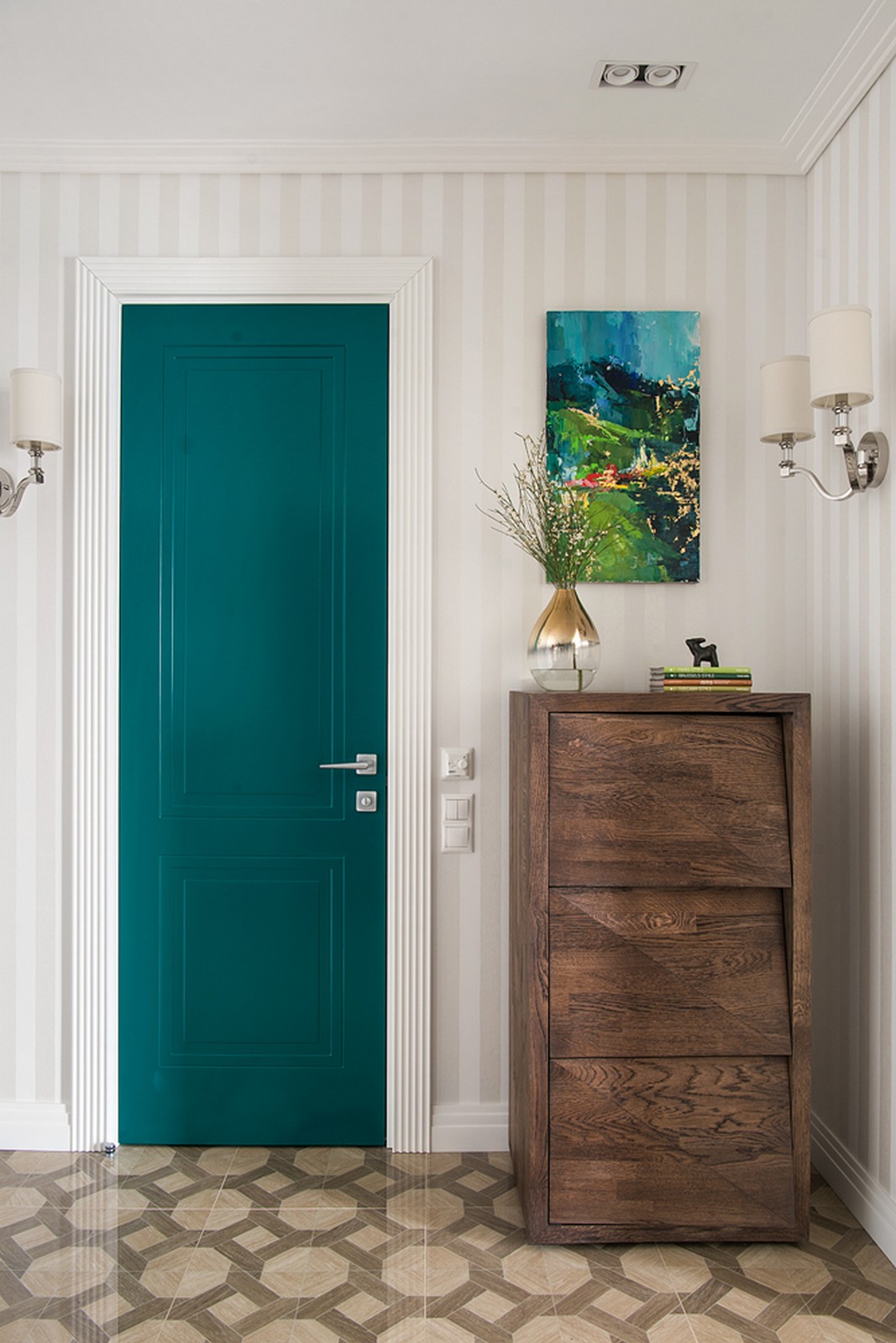 Очередной удачный пример того, что двери и погонаж совсем необязательно должны быть одинакового цвета. Посмотрите, как удачно белый наличник оттеняет изумрудный цвет дверного полотна.