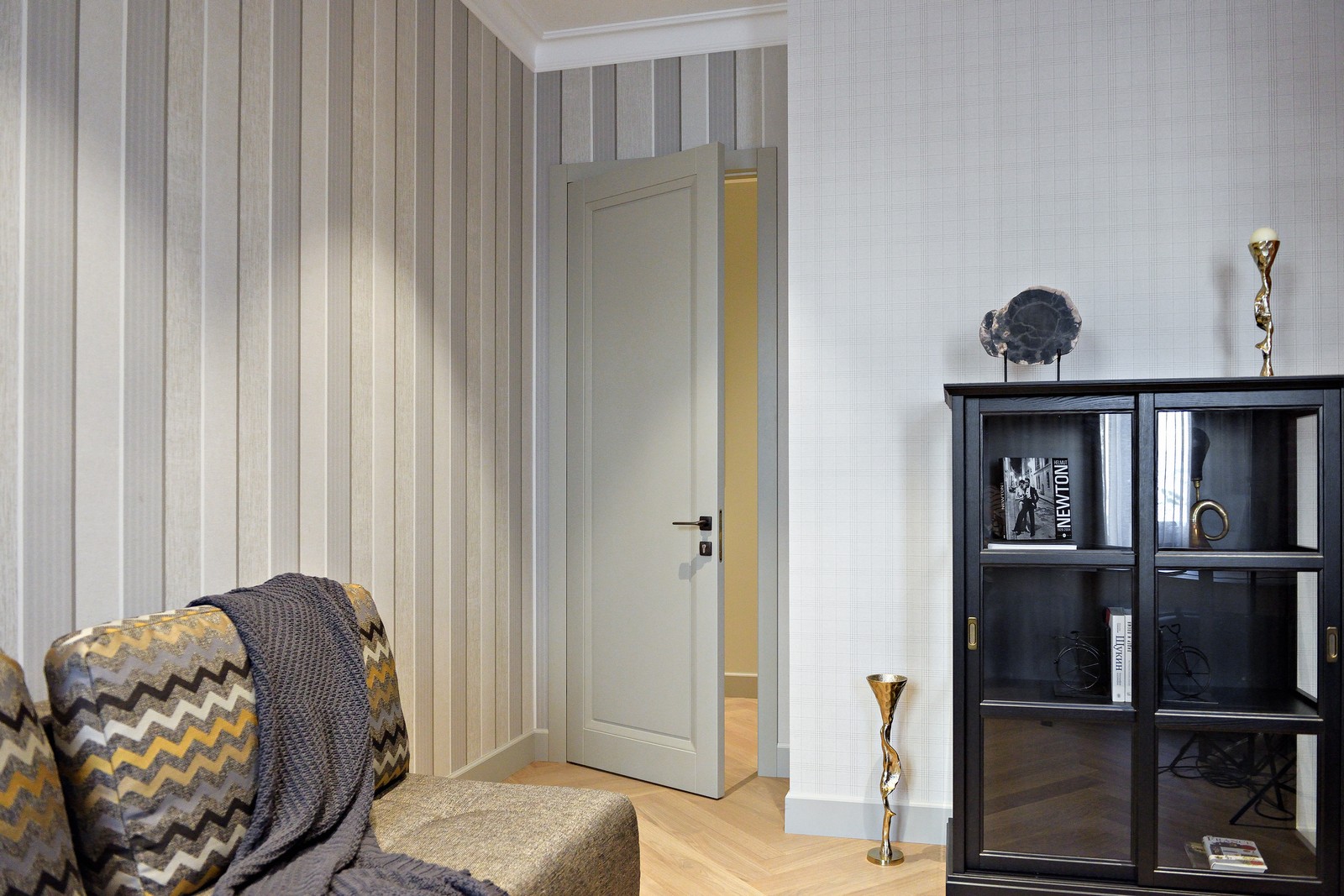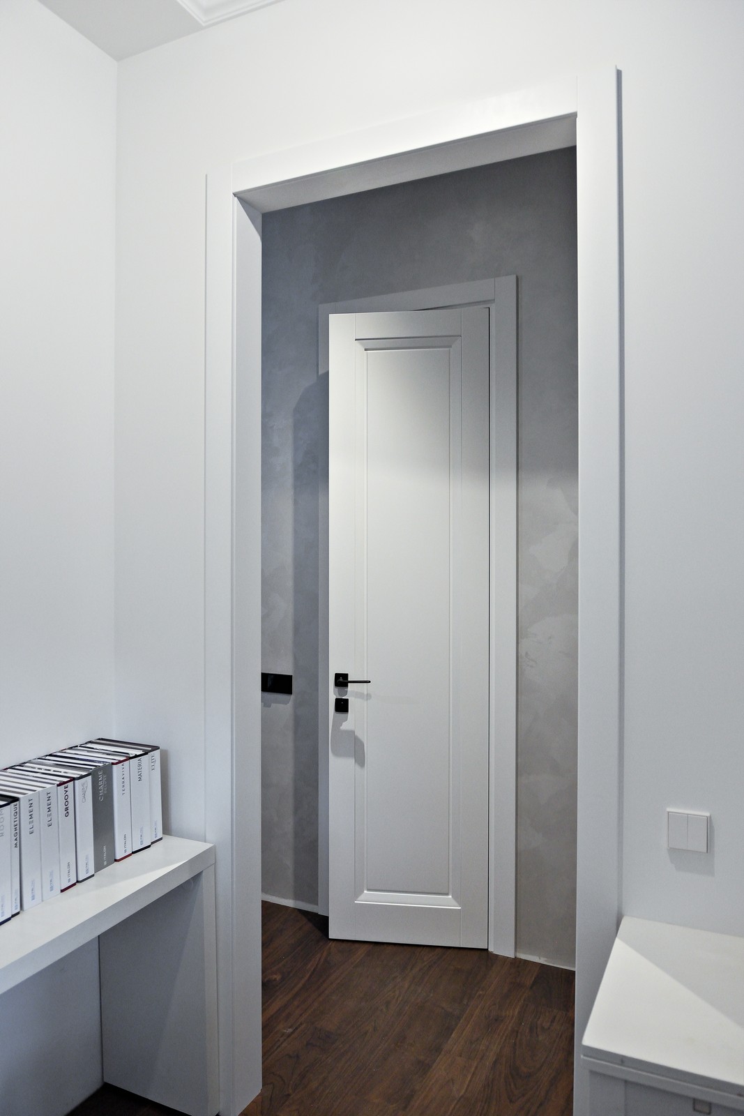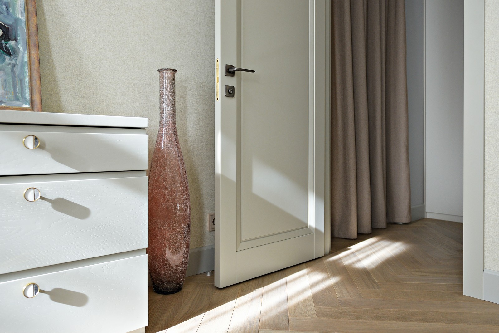 Теплый серый цвет RAL7044 является для нас стандартным - его можно заказать без доплаты. Короб-моноблок FLAT с компланарным наличником делает эмалевые двери OPERA с классической формой филенок более современными и универсальными. Именно такой стиль мы и называем - неоклассика.