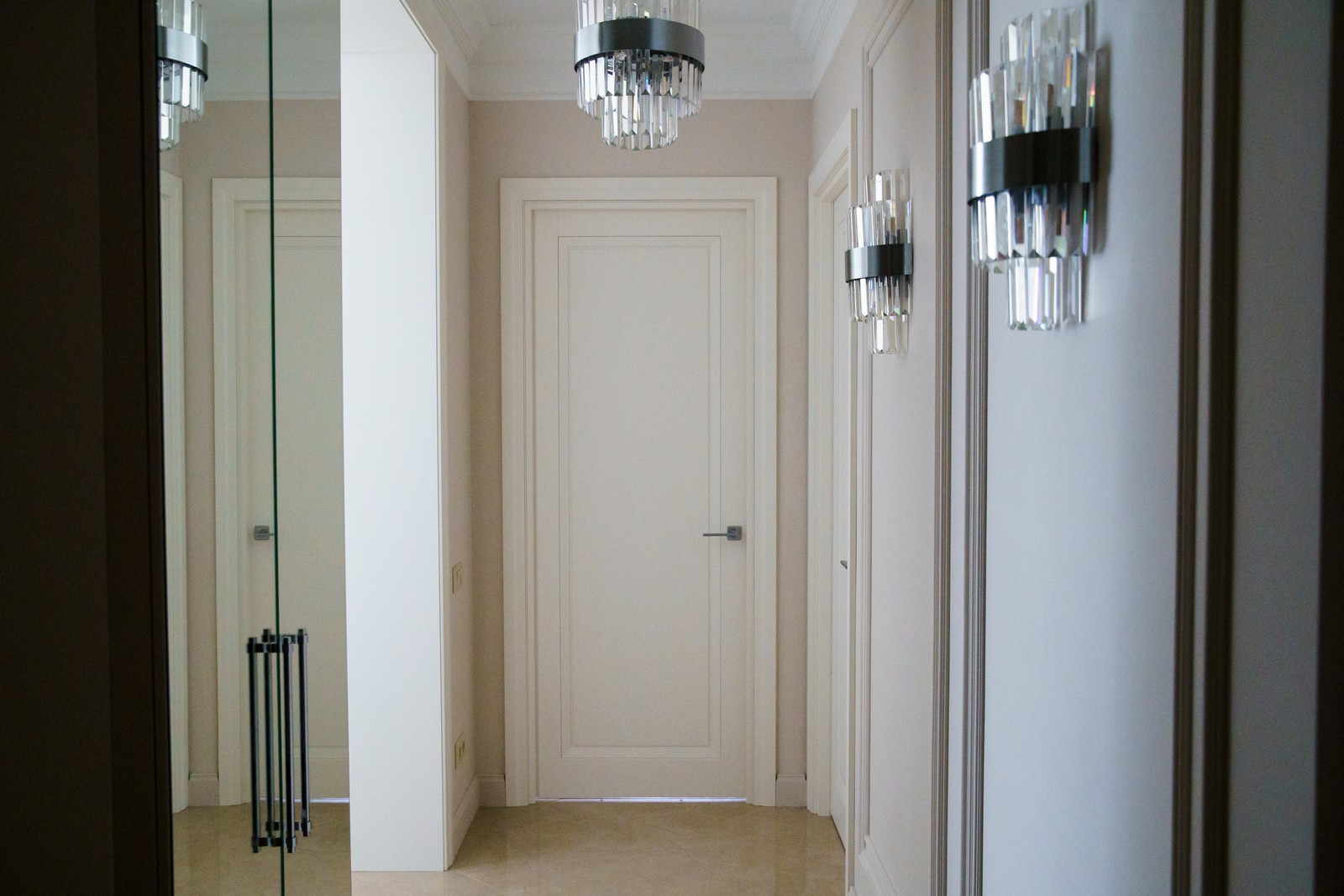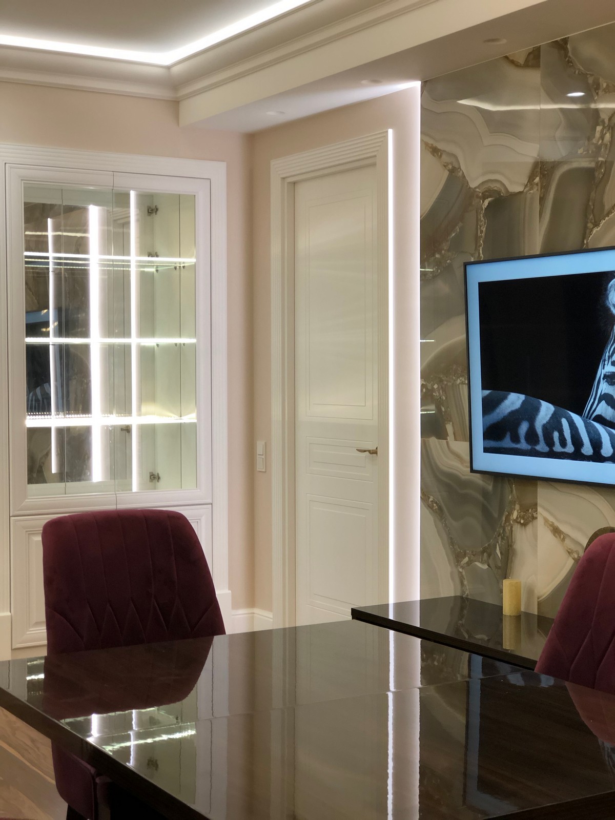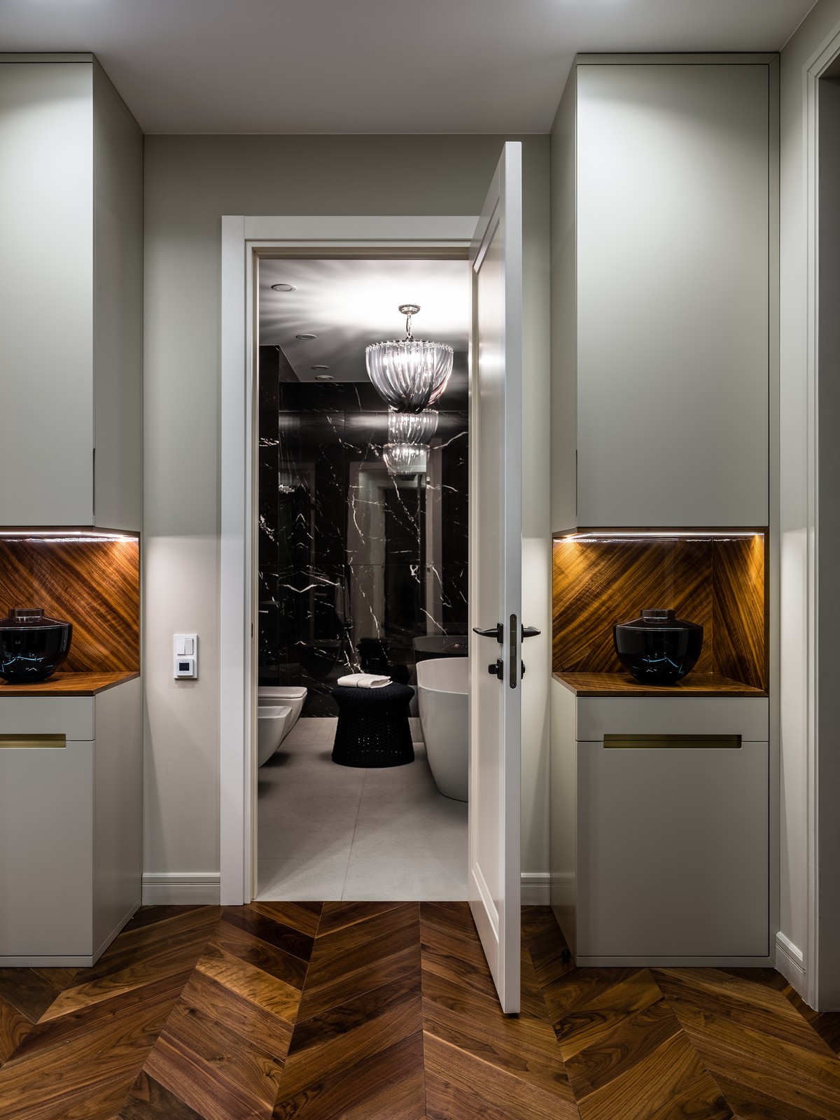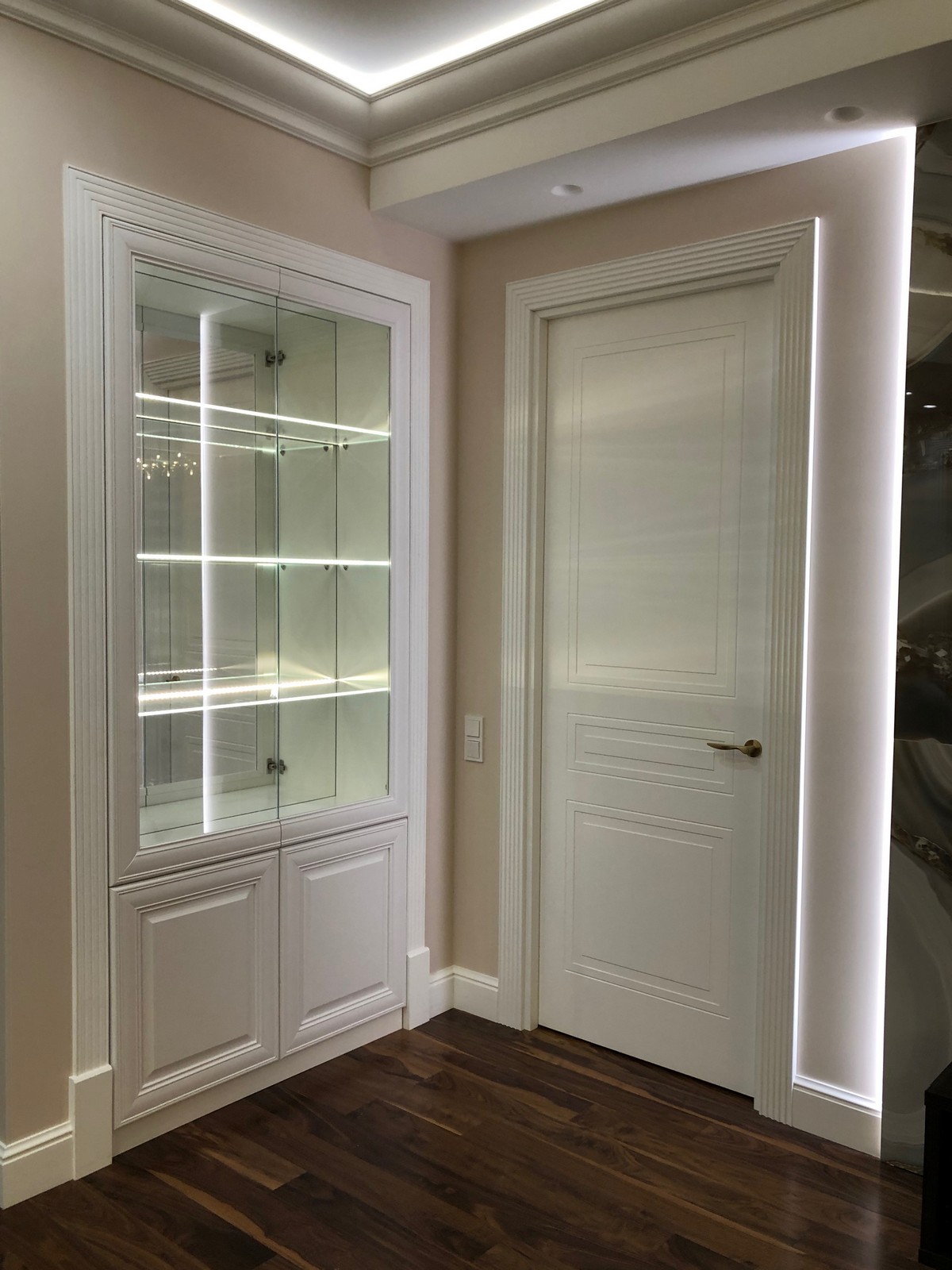 Наши эмалевые неоклассические двери с широким фигурным наличником отлично вписались в проект дизайнера Лилит Агамаловой. А необычная подсветка добавила им немного гламурности и таинственности.