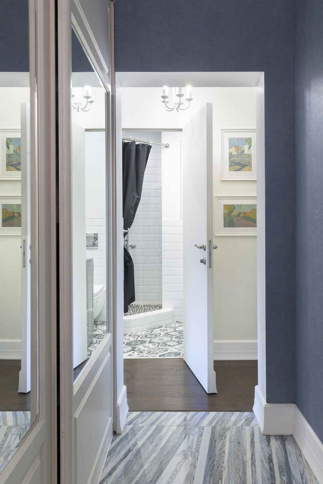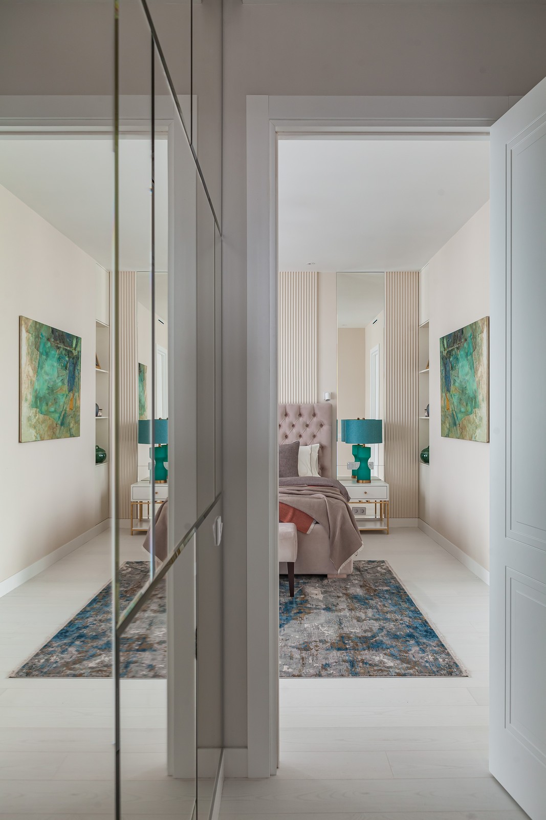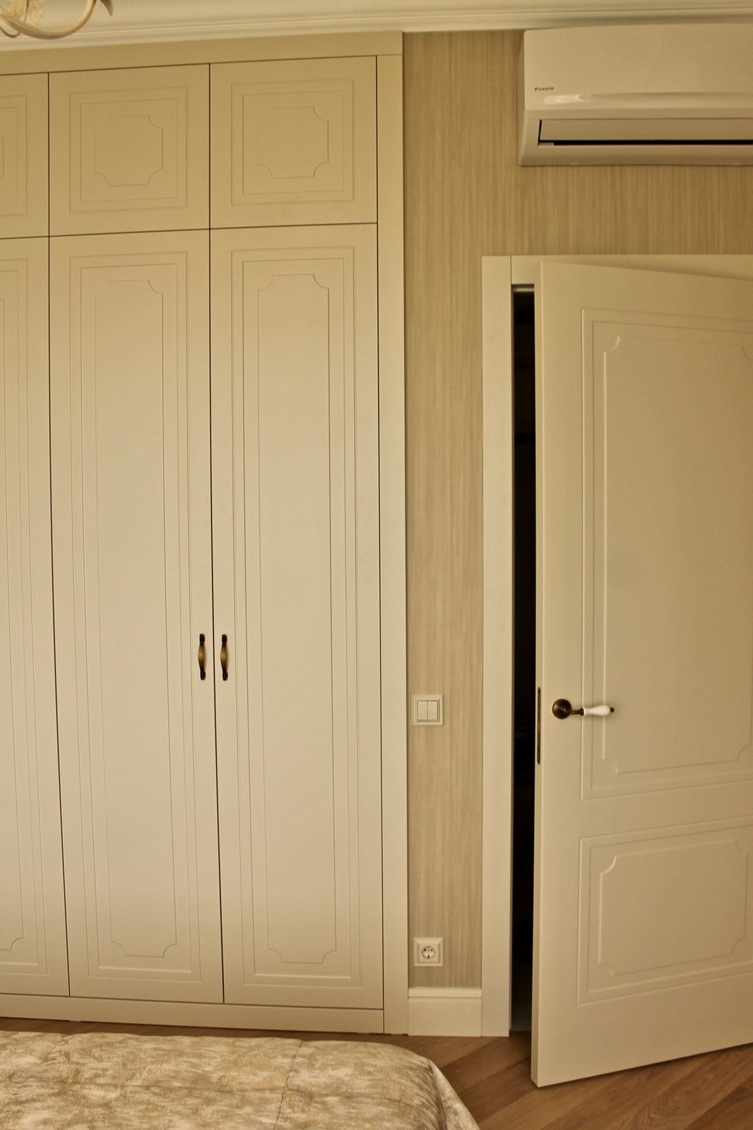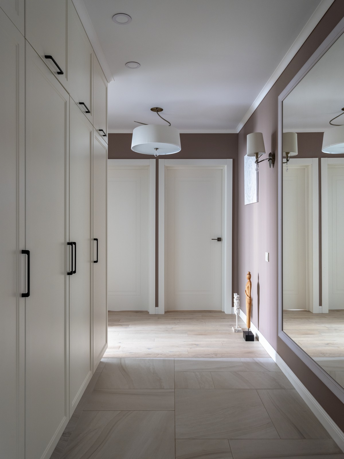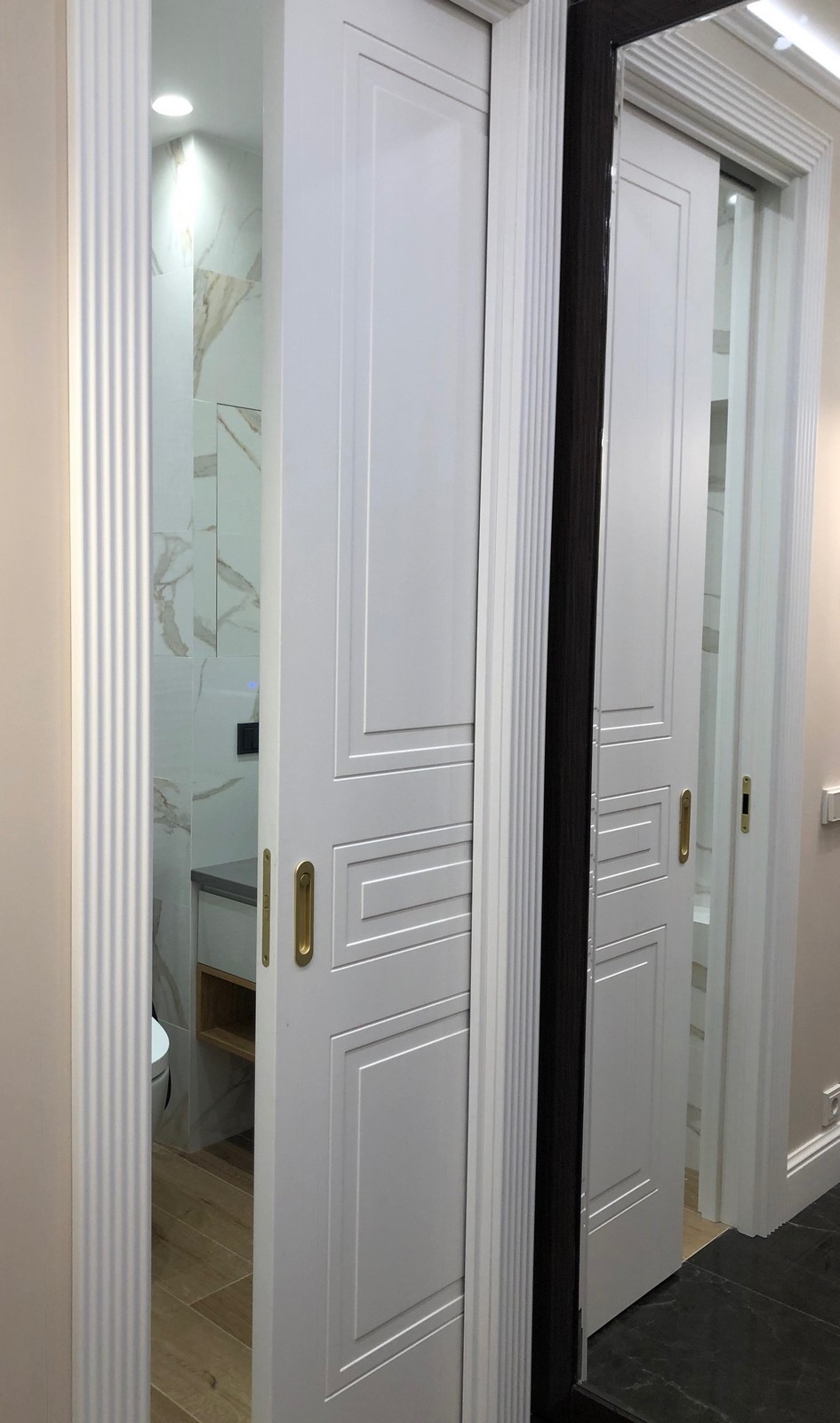 Наши эмалевые неоклассические двери с широким фигурным наличником отлично вписались в проект дизайнера Лилит Агамаловой. А необычная подсветка добавила им немного гламурности и таинственности.