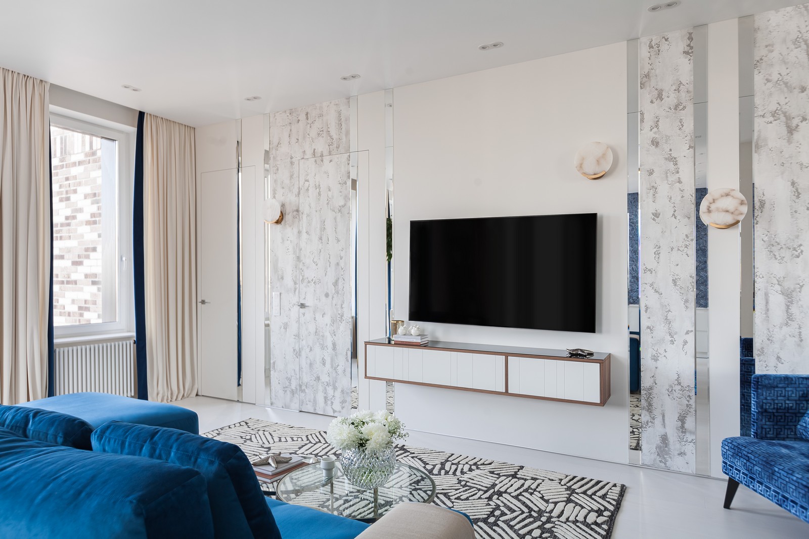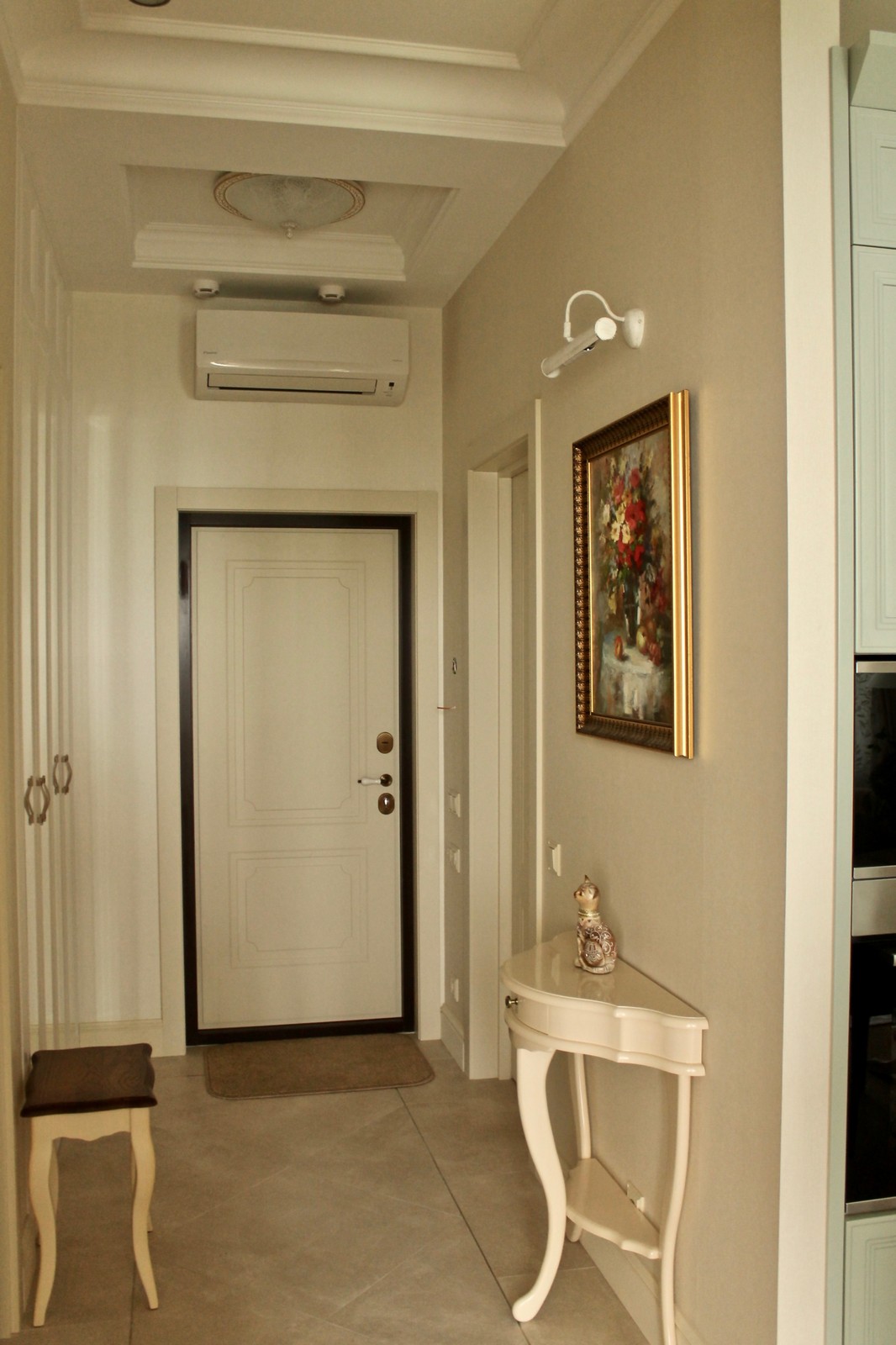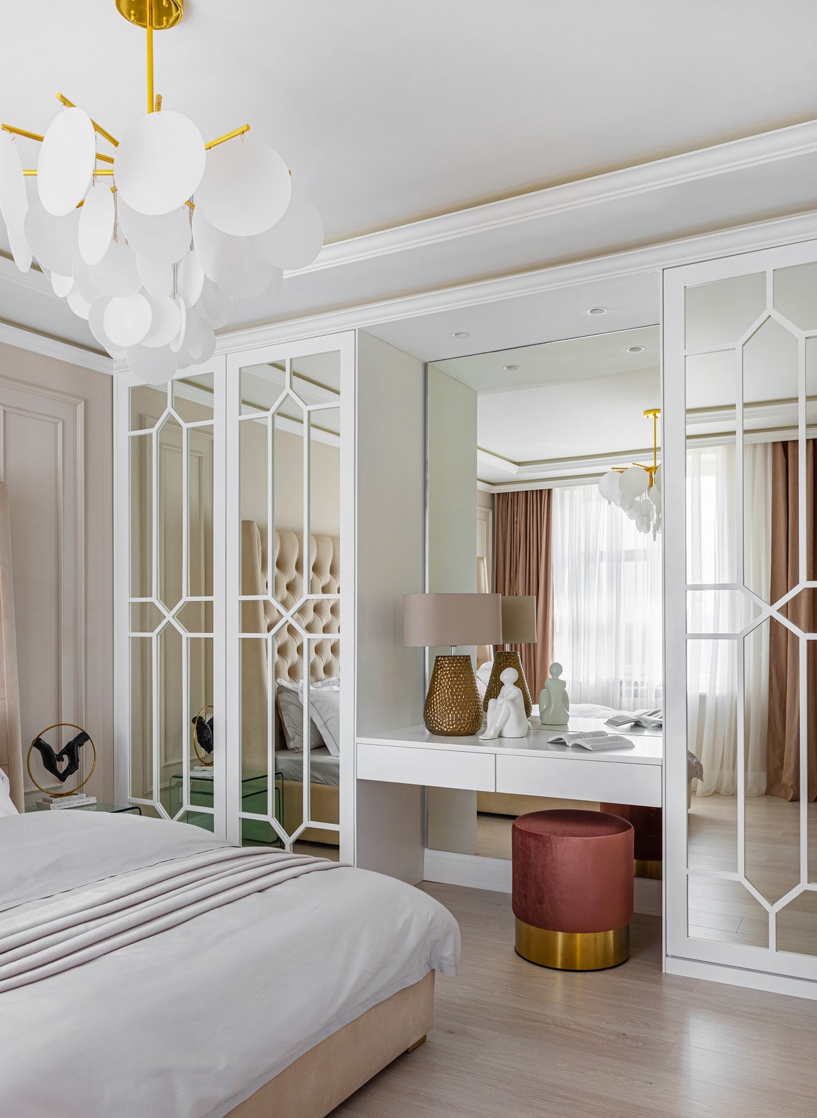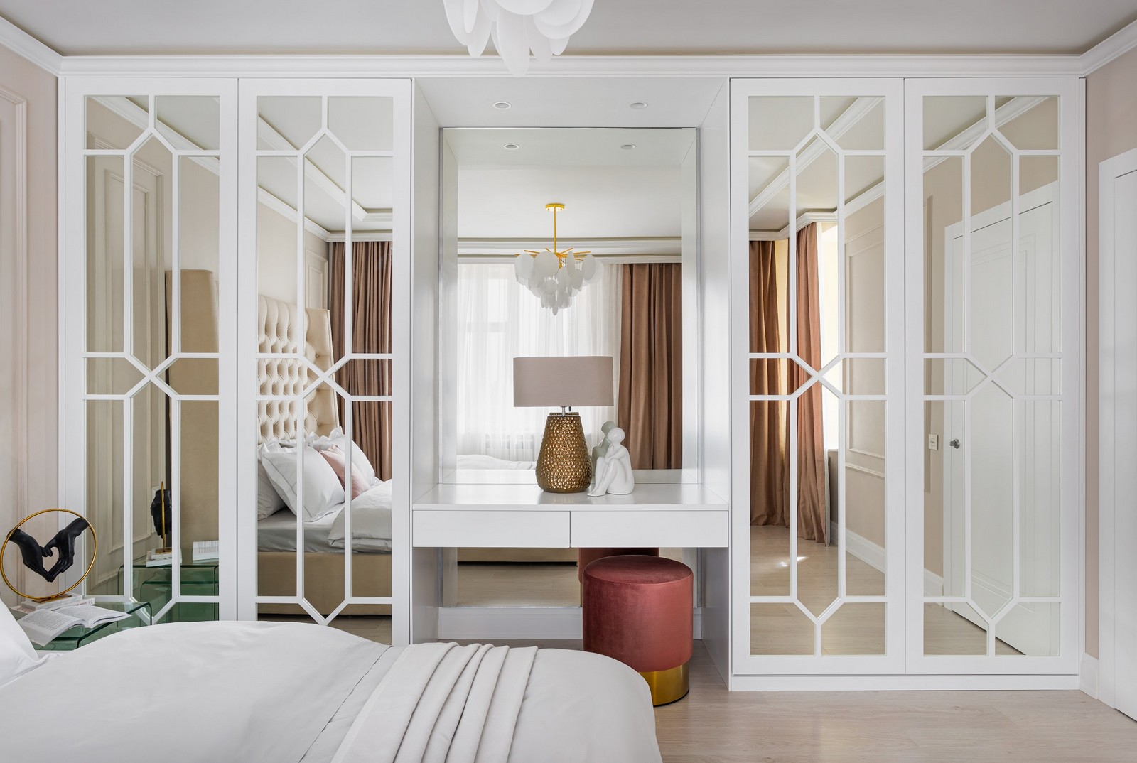 Наши эмалевые неоклассические двери с широким фигурным наличником отлично вписались в проект дизайнера Лилит Агамаловой. А необычная подсветка добавила им немного гламурности и таинственности.