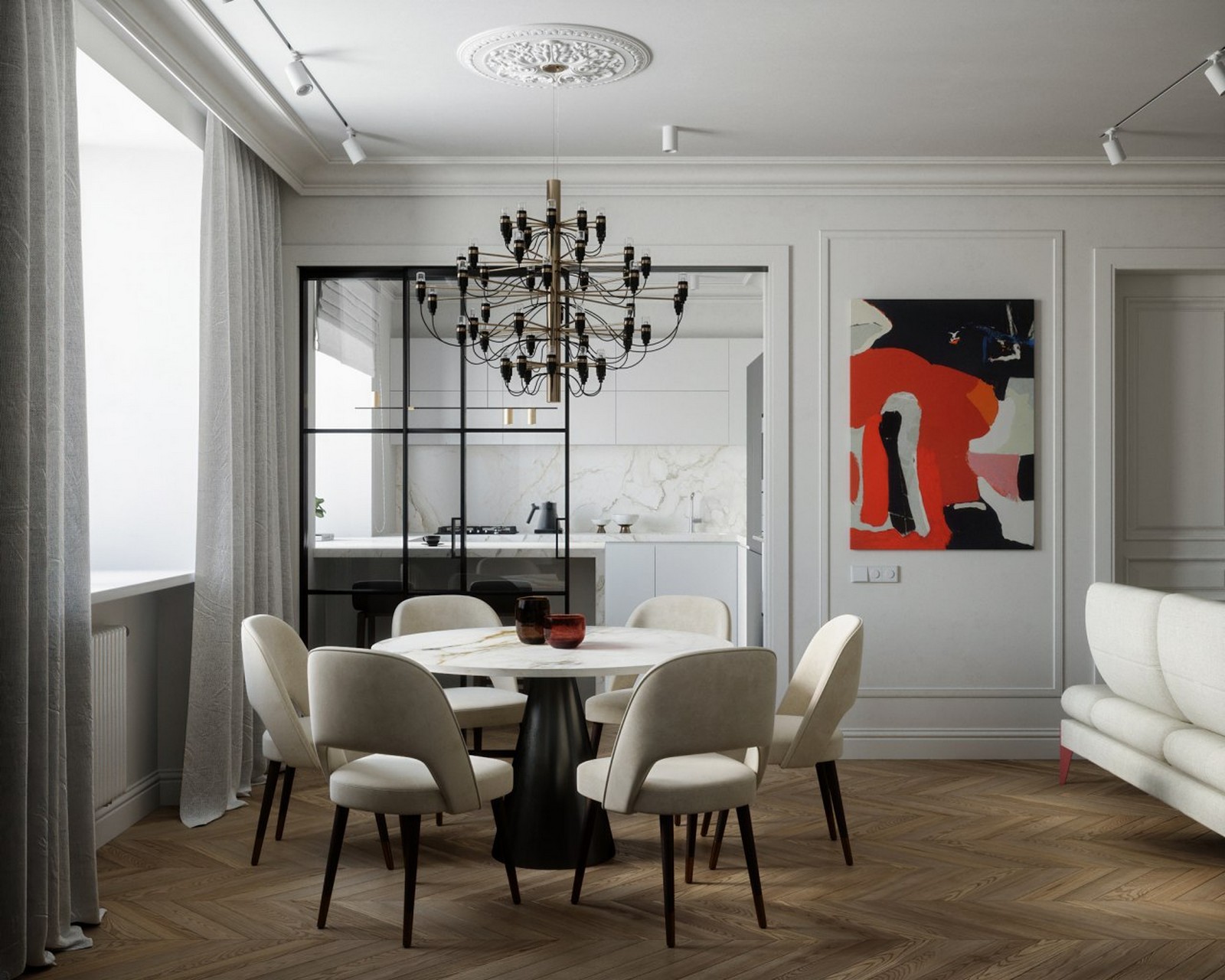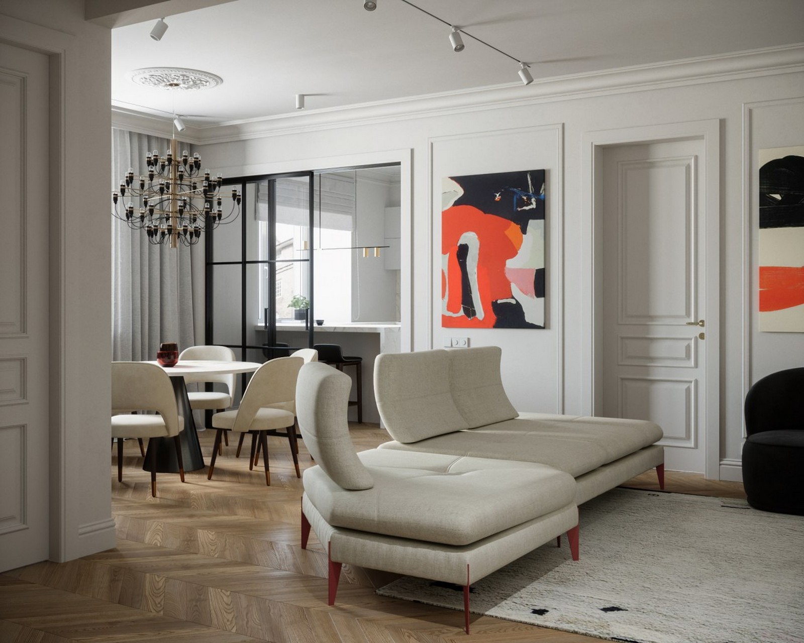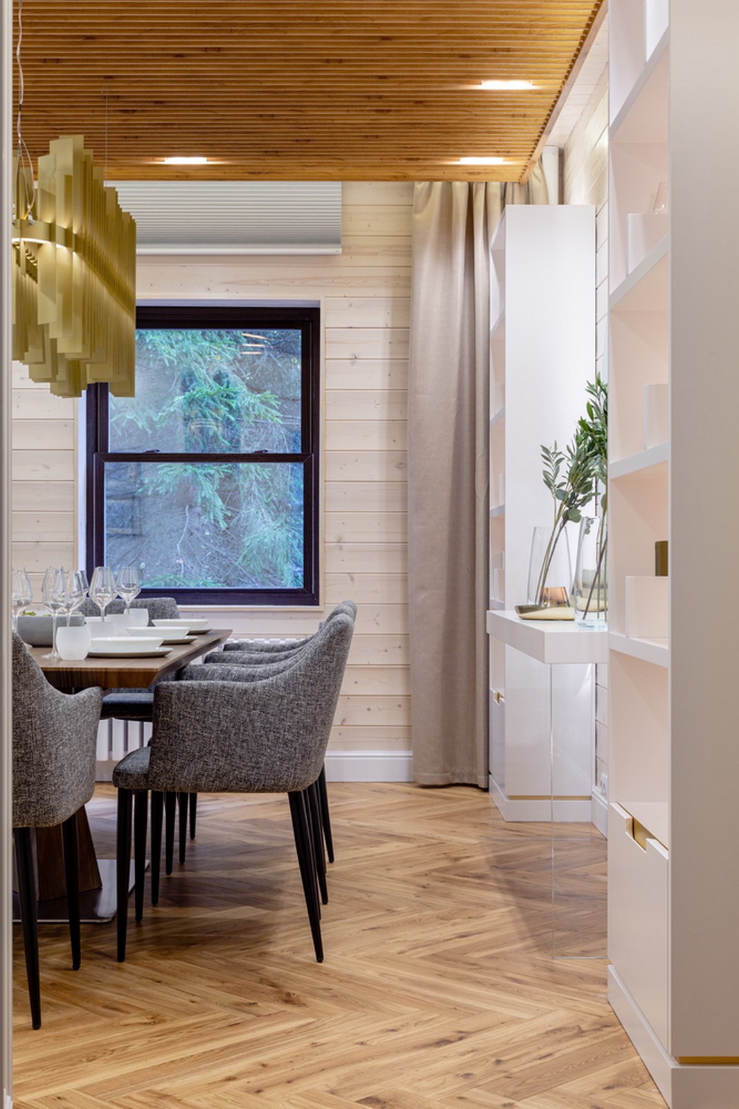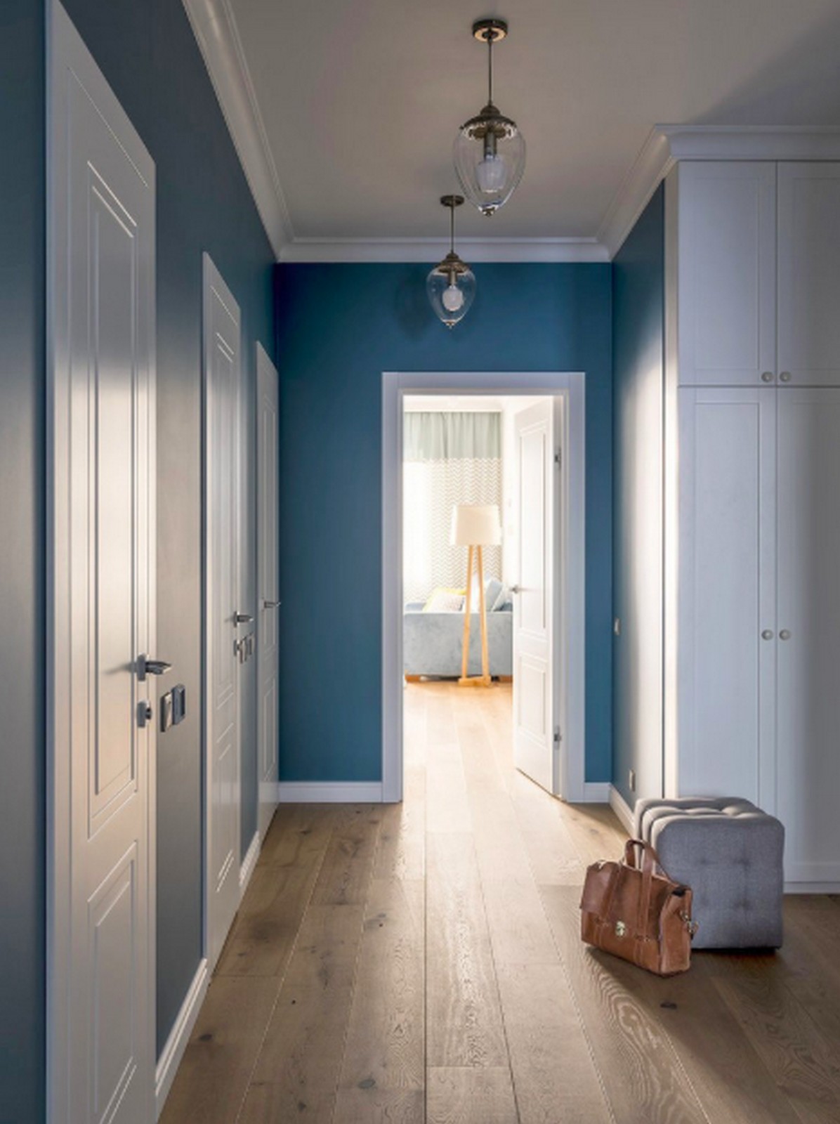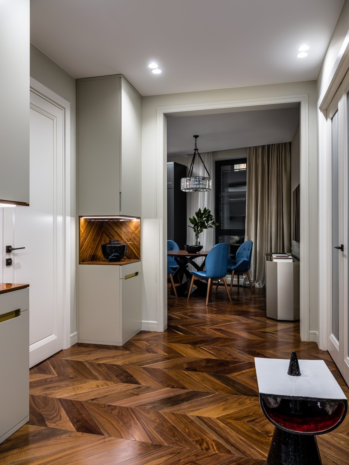 Треугольный штапик на двери OPERA отлично сочается с рисунком паркета "французская елка". Обратите также внимание, как элегантно и практично смотрится раздвижная дверь-пенал, ведущая в санузел.