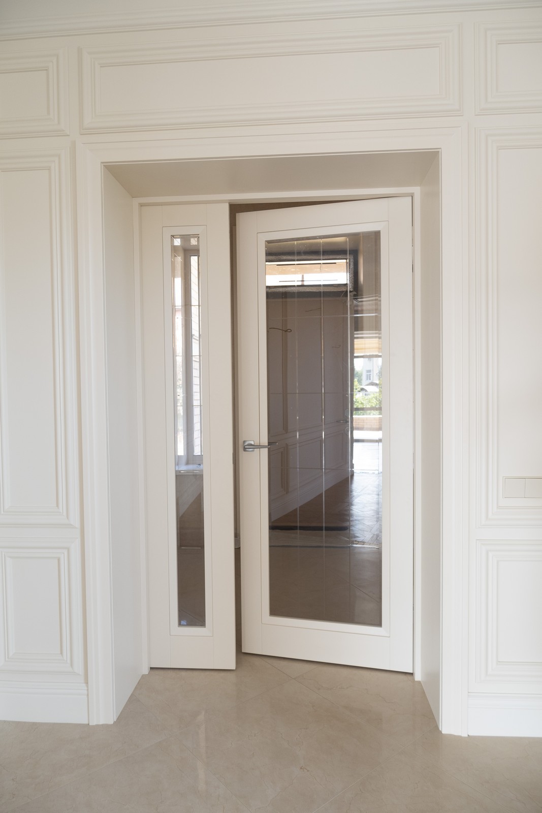 Проект дизайнера Надежды Галаничевой. Двери VERONA 55 с большой площадью остеления и английской решеткой делают интерьер более легким и стильным. Также мы изготовили для этого объекта красивый портал, обрамляющий проем.