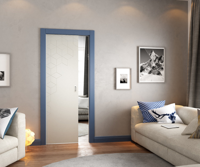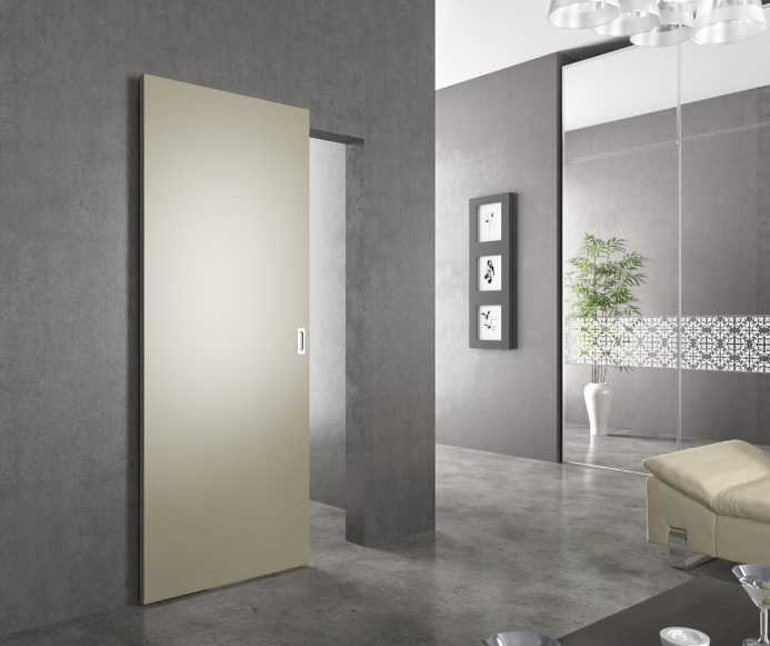 Любую дверь DORIAN можно выполнить в виде раздвижной двери внуть стены — в специальный металлический пенал, который затем покрывается гипсокартоном. Пенал необходимо установить заранее в процессе ремонта.