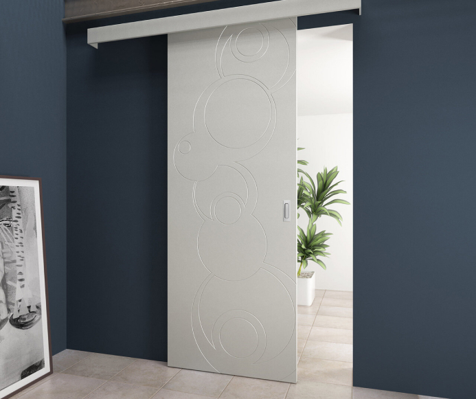 Любую дверь DORIAN можно выполнить в виде раздвижной двери по поверхности стены. Раздвижная система скрыта фирменным карнизом в цвет полотна. Дополнительно можно заказать обрамление проема.