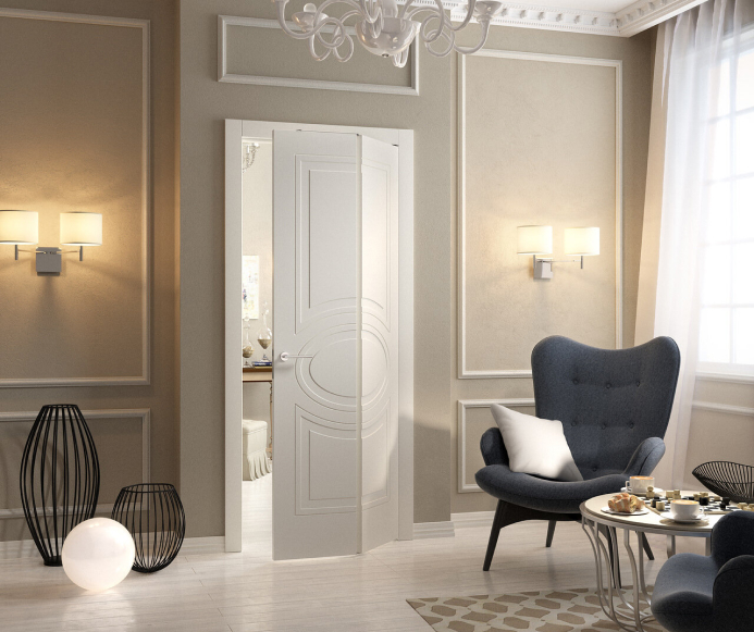 Двери коллекций COLORE, VERONA, BELVEDERE — можно выполнить в виде книжки TWIN. Ключевая особенность — в отличие от обычной книжки эта дверь не сужает проем при открывании — она складывается к стене.